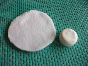Zwei Stoffkreise (etwa 8 cm im Durchmesser, in Zukunft wird der ‚Pilzhut‘ bei mir aber einen größeren Durchmesser haben, damit es realistischer aussieht)