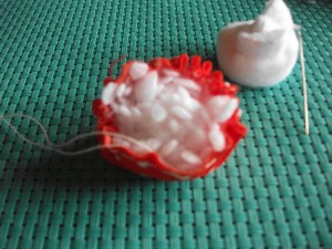 Ein langes Stück Faden in die Nadel einfädeln, rund um das Stück Stoff kleine Stiche machen und schon mal leicht einkräuseln. Die entstandene Halbkugel prall mit der Füllwatte ausstopfen und dann den Faden komplett anziehen.