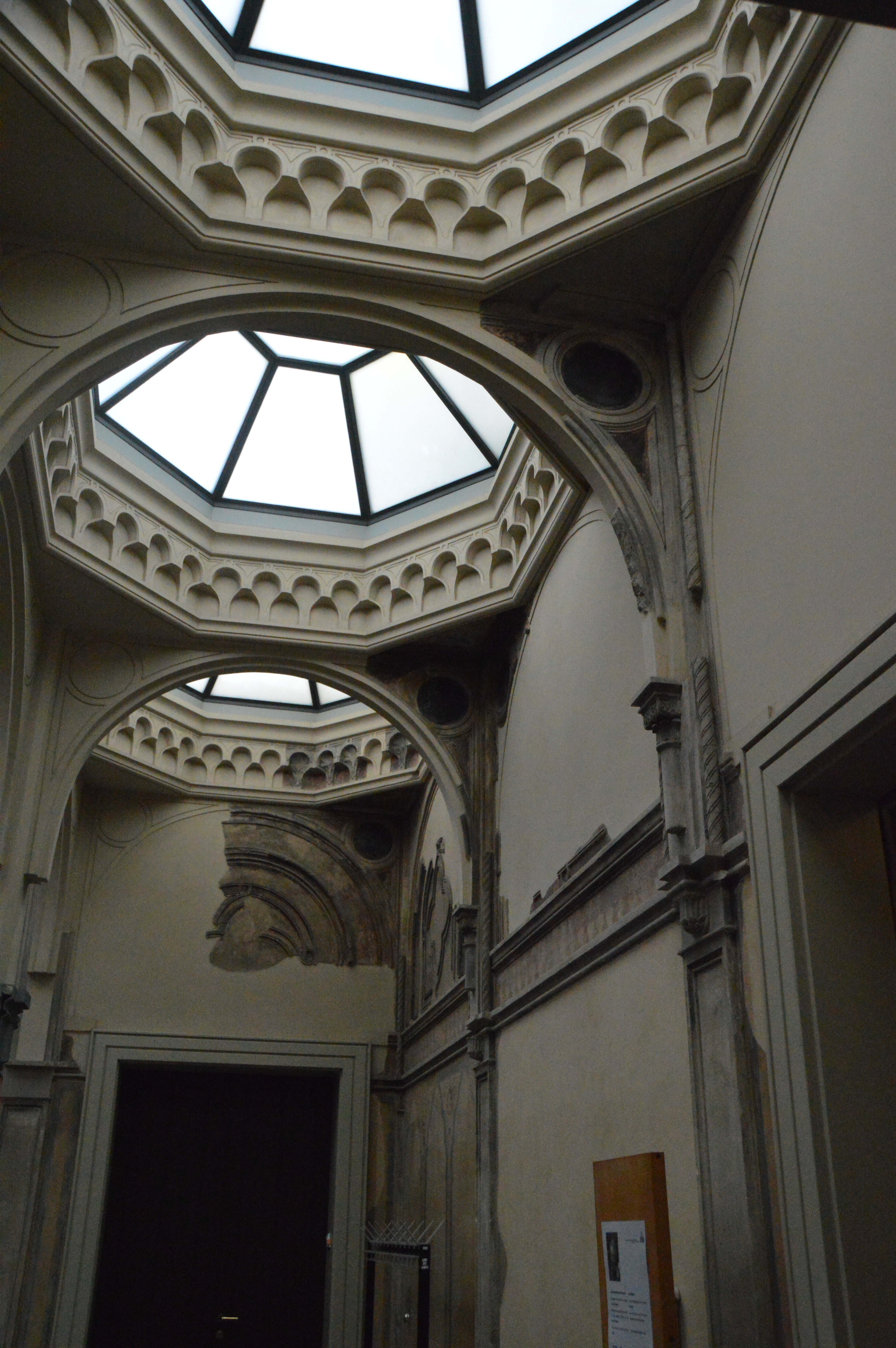 Auf dem unteren Bild kann man teilweise auch noch die Originalbemalung im maurischen Stil erkennen. Vieles war im Laufe der Zeit durch Wassereinbrüche und allgemeine Verwahrlosung verrottet. Bewusst hat man beim Wiederaufbau diese Kontraste zwischen ursprünglicher und neuer Substanz gesetzt.