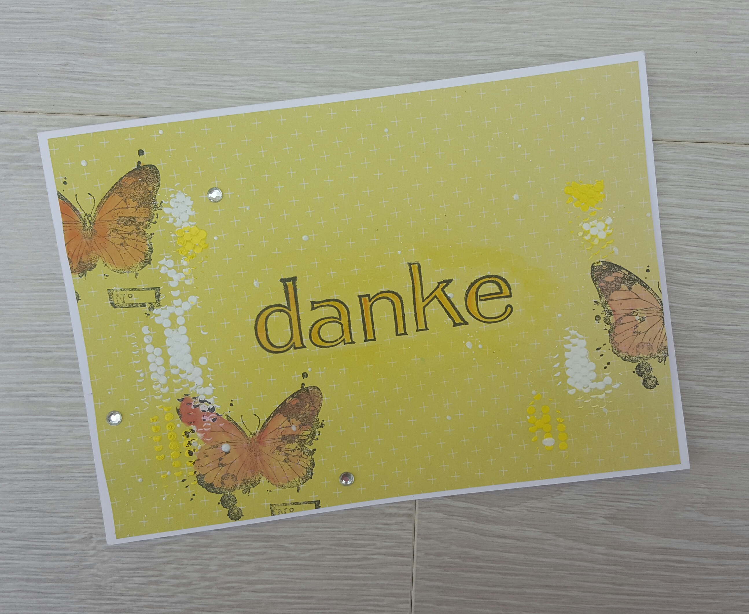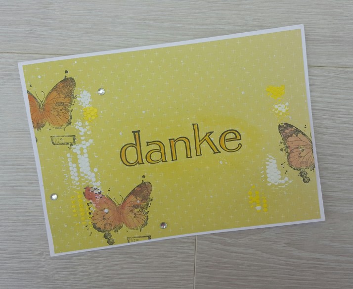 Die Schmetterlinge von Carabelle Studio stempelte ich mit Archival Ink auf Papier von Paige Evans. Koloriert wurden sie mit Farben von Crate Paper. Dazu Acrylfarben von Liquitex, weißes IrRESISTible und einige Strasssteine. Gewünscht war explizit KEINE Babykarte, so dass ich mich für diese frühlingsfrische Kombinationen entschied.