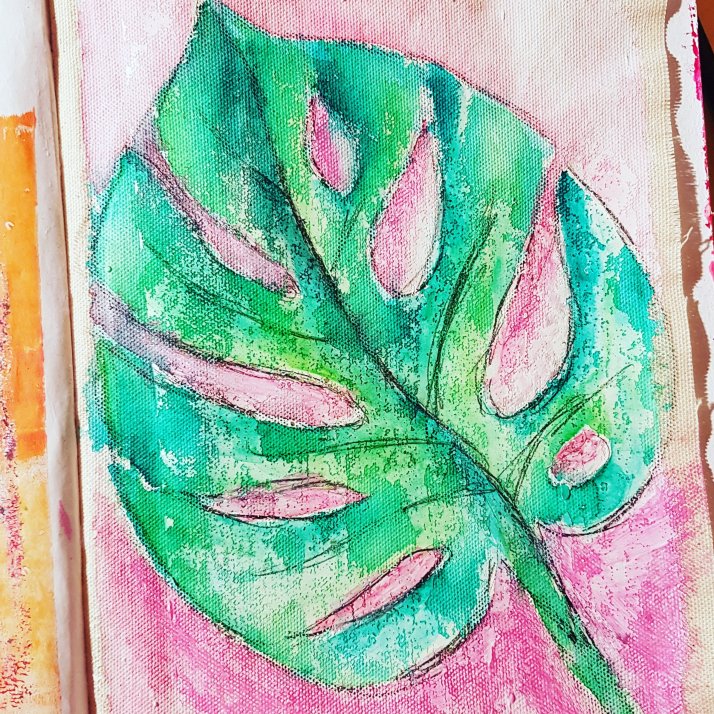 Unbezahlte Werbung. Schon lange schwebte mir vor, nicht nur abstrakt zu malen. Als einfacher Einstieg bietet sich meine Lieblingspflanze an. Das Blatt habe ich mit Bleistift vorgezeichnet. In meinem Art Journal sind ganz unterschiedliche Untergründe verarbeitet. Hier habe ich mich für Leinen entschieden, welches ich mit Gesso grundiert hatte. Verwendet habe ich meine Aquarellfarben in verschiedenen Grüntönen. Für den Hintergrund kam mein Lieblingspinkton Quinacridone Magenta zum Einsatz. Dazu noch ein Violettton für mehr Tiefe sowie Tempera-Stifte.