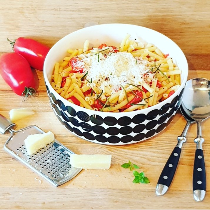 Zu der Pasta mit roher Tomatensauce habe ich mich durch einen Blogpost inspirieren lassen. Ich liebe Foodblogs so sehr, denn da sind die talentiertesten Leute am Werk. Die normalen Tomaten mag ich gar nicht essen, denn die haben wahnsinnig viel glibberiges Innenleben. Ich habe hier Ochsenherz-Tomaten verwendet, aber auch Fleischtomaten mag ich extrem gerne. Für gewöhnlich esse ich keine rohen Tomaten, aber sobald diese blanchiert wurden, kann ich sie ganz gut essen, ohne dass ich allergische Reaktionen in der Mundhöhle bekomme.