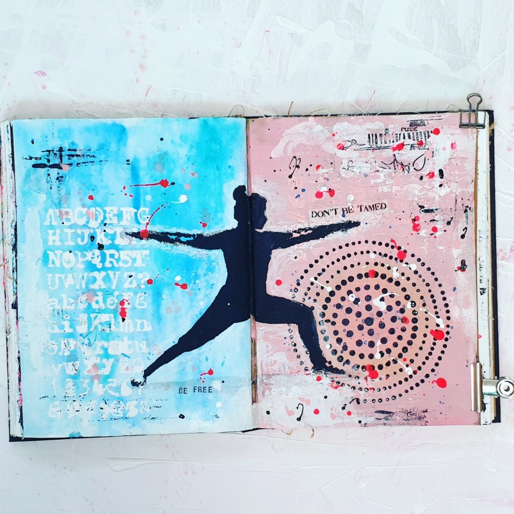 Irgenwie mag ich die Seite ja schon, wenn nicht genau der Farbkontrast Rosa/Blau wäre. Das hat sowas von Gender – diese uns auferlegten Zwänge von außen sind doch einfach Bullshit…. ich hatte tatsächlich einfach noch ein wenig Rosa in meinem Pinsel, so dass ich ohne nachzudenken die Craft-farbene Seite damit bemalt habe. Das Blau war ja schon da. Mir ist die Rosa-Hellblau-Falle tatsächlich erst später aufgefallen, aber ich denke, dass ich das Beste daraus gemacht habe.