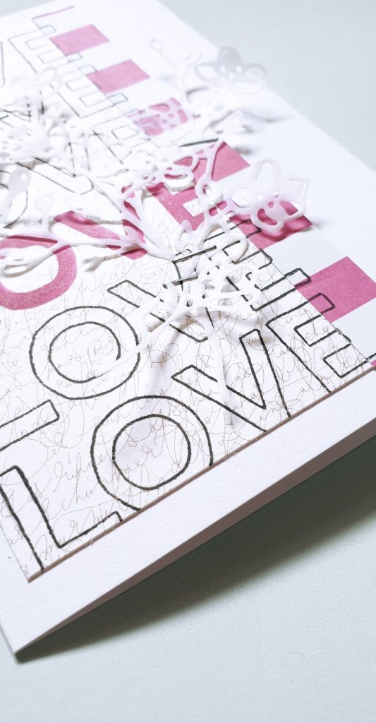 Explizite Baby- oder Geburtstempel habe ich nicht in meinem Fundus, aber da so ein Baby mit Liebe geradezu überschüttet wird, passten die Love-Stempel von Felicity Jane meiner Ansicht geradezu perfekt. Ich habe noch etwas Patterned Paper von Alexandra Renke und Rosie’s Studio dazu verwendet und mit Stanzteilen aus Vellum ergänzt.