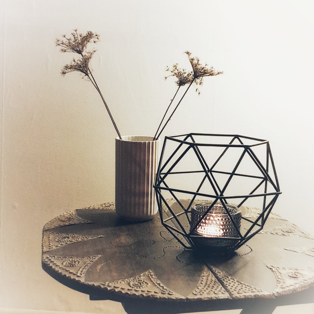 Auf dem kleinen Klapptische, der ebenfalls aus dem Weltladen stammt, habe ich aktuell eine meiner Lyngby-Vasen mit einigen Blütenständen dekoriert und ein iittala-Windlicht mit einem Lampenschirm von IKEA kombiniert. Ich mag die Schlichtheit des Arrangements, das trotzdem ziemlich besonders ist.