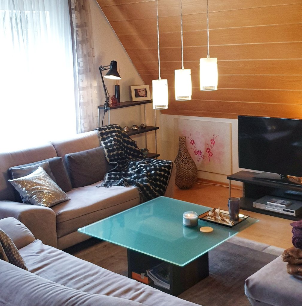 Auch hier im Wohnzimmer herrscht wieder Holz vor, aber das finde ich persönlich gar nicht schlimm, sondern richtig schön heimelig. Am Regal neben dem Zweisitzer-Sofa habe ich meine Leselampe befestigt. Dank Steckdose, die ich per Fernbedienung schalten kann, ist es gar nicht wichtig, dass der Anschluss zu den diversen Leuchten hinter dem selbst gestalteten Bild befindet.
