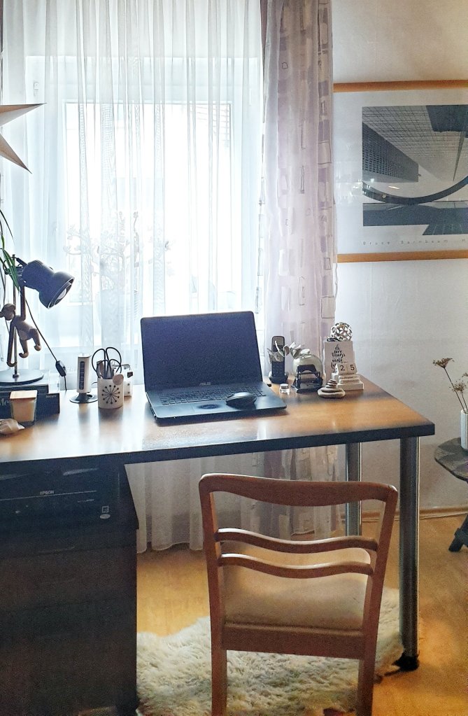 Den Schreibtisch und die Geschichte dazu stelle ich Euch nochmal separat vor. Aber auch hier – ziemlich viel Vintage: die Schreibtischlampe ist älter als ich [hab ich meinem Papa abgeschwatzt], der Stuhl stammt von meinen Großeltern, dazu der hübsche Affe von Kay Bojesen. Im Büro sieht mein Schreibtisch oft richtig chaotisch aus, zu Hause versuche ich, diesen so aufgeräumt wie möglich zu lassen.