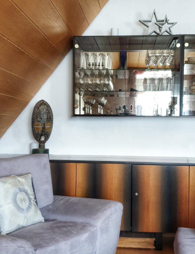 Deren reduzierte Form stellen das Holz und dessen Farben in den Vordergrund. Trotz des Alters der Möbel sehen die heute noch extrem modern aus. In den Hängeschränken, deren Türen aus Rauchglas bestehen, sind die Rückwände mit Spiegeln verkleidet. Dadurch duplizieren sich die Gläser, die ich dort aufbewahre, allerdings wird auch das Licht der gegenüberliegenden Fenster reflektiert und der Raum wirkt trotz der Dachschrägen ziemlich hell.