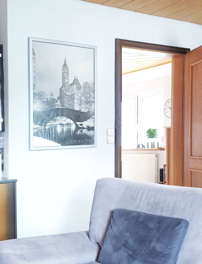 Das rechte Bild zeigt den Blick vom Zweisitzer Richtung Esszimmer, als genau die Blickachse vom ersten Bild in umgekehrter Richtung. Die Bilder hier im Wohnzimmer habe ich schon seit Ewigkeiten, aber diese Schwarz-Weiß-Poster passen einfach so gut in die Stimmung, die dieser Raum bei mir erzeugt…