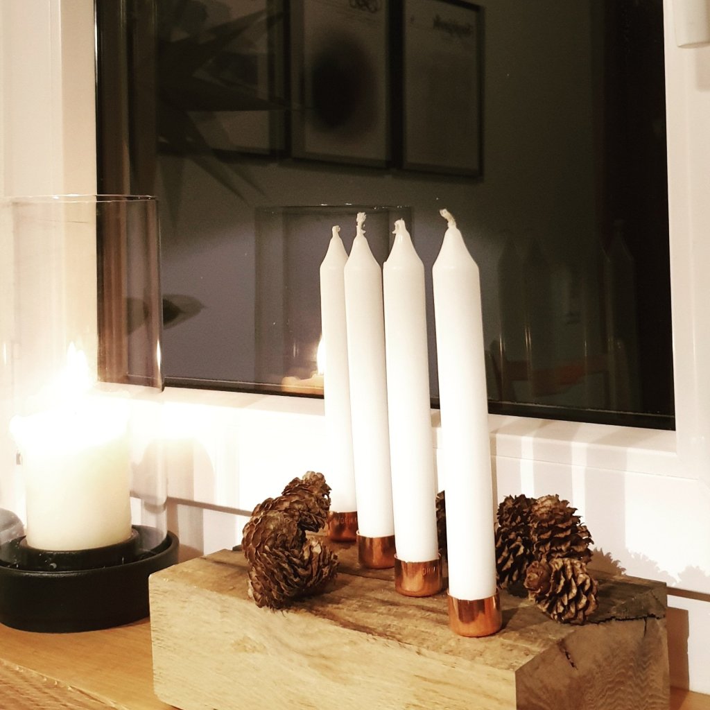 Montag Morgen war ich dann im Ort unterwegs und bin dann auch noch eben in den Baumarkt – musste sowieso noch was für die Baustelle im Keller beschaffen. In dem Gang mit dem Installationszubehör fiel es mir wie Schuppen von den Augen: die Kupferkappen sollten unbedingt Bestandteil des Advents“kranzes“ sein. Holz habe ich sowieso zu Hause und so musste ich mur „nur“ noch überlegen, wie ich alles anordnen möchte.