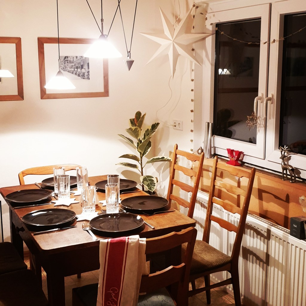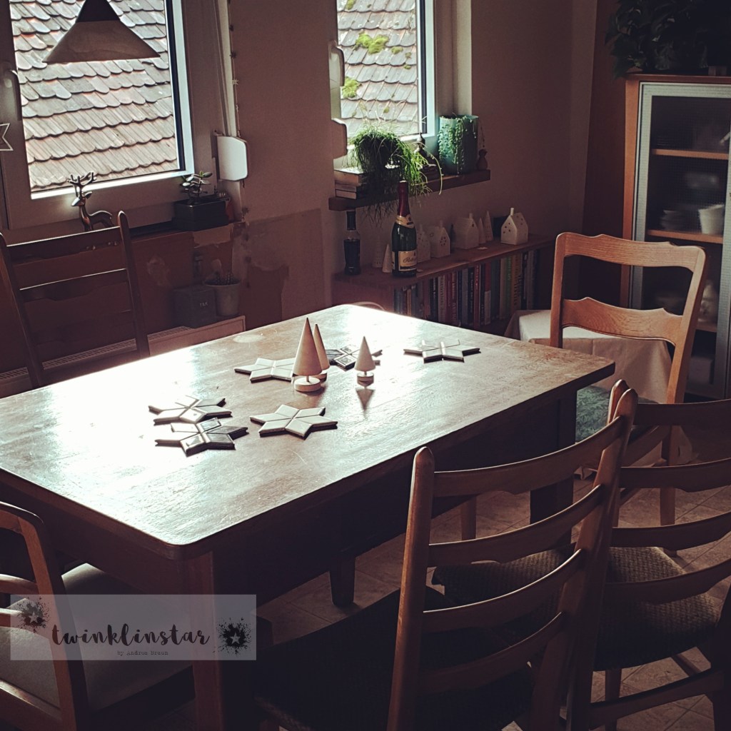 Heiligabend verbrachten wir 2019 erstmals bei mir. Hier seht Ihr den Tisch, wie ich ihn am Vorabend eingedeckt hatte. Ich mag es sehr, wie festlich die Untersetzer in Sternform wirken! Zusammen mit den „guten“ Kristallgläsern macht das wirklich was her. Ich freu mich jetzt schon auf die Adventszeit – spätestens am Wochenende werde ich mir diese Coaster griffbereit auf die Fensterbank legen….