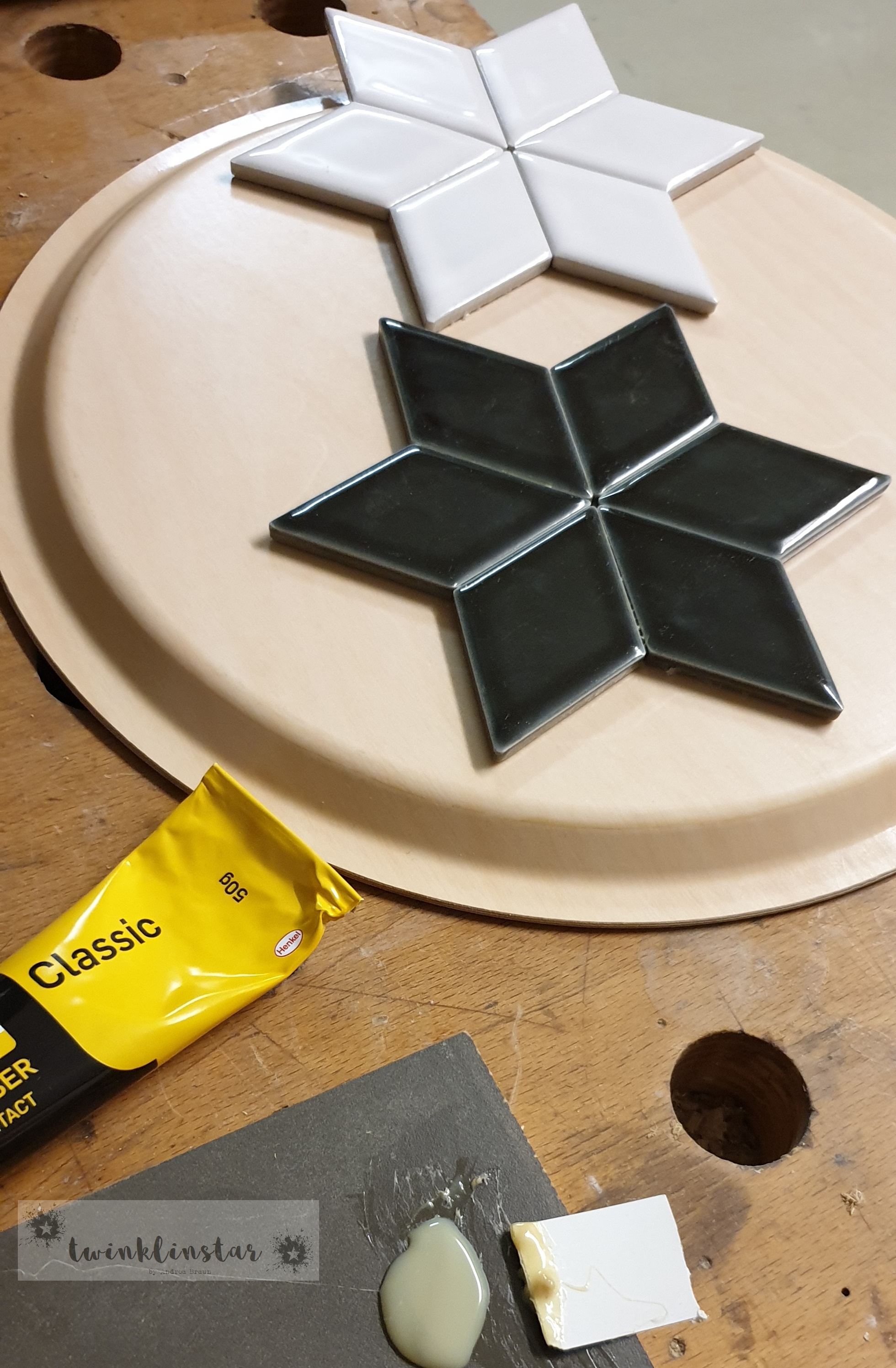 Die Kanten der einzelnen Fliesenstücke werden mit dem Kontaktkleber DÜNN bestrichen. Bitte unbedingt vorher die Gebrauchsanleitung durchlesen! Der Kleber muss erstmal antrocknen, bevor die Einzelteile aneinander gepresst werden.