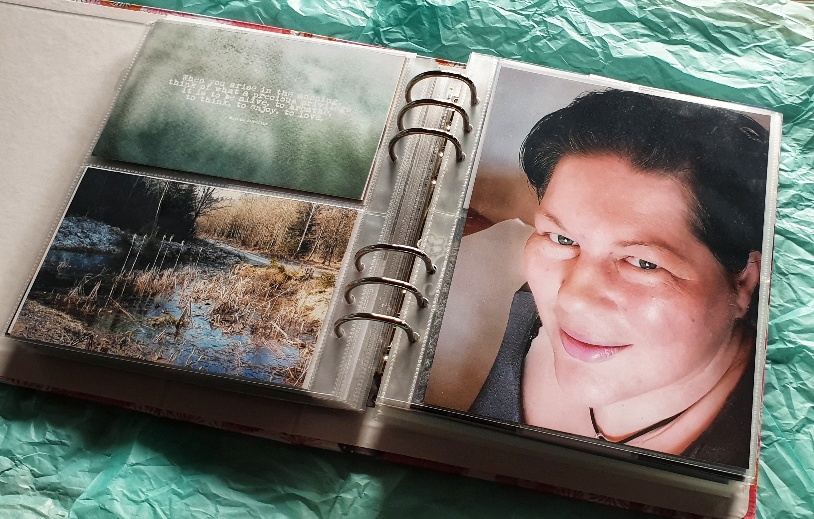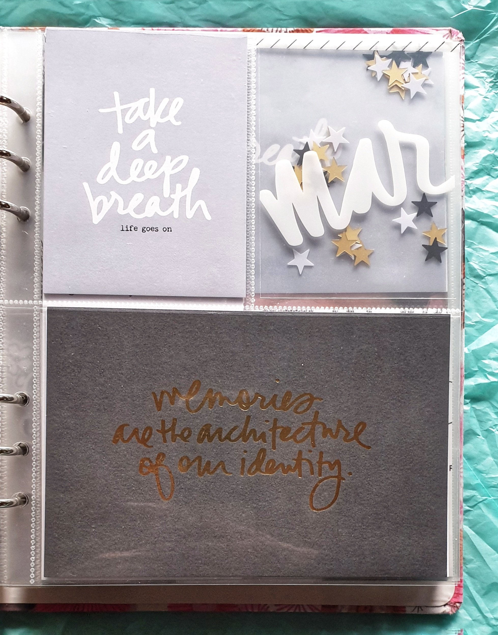 Ich wollte den Monat auch unbedingt bildlich dokumentieren. Da kamen mir die Folien mit den 2×2 Inch Taschen genau recht. Insgesamt sind das 48 Bilder, die in den beiden Folie untergebracht werden können. Ich habe hier einfach Journaling und Filler-Cards in der mittleren Spalte eingefügt, um hier eine gewisse Struktur für mich selbst zu erzielen.