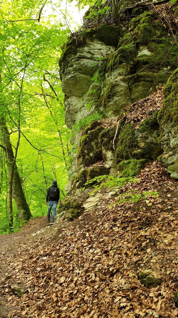 Auf diesem Teilstück war ich wirklich sehr froh um meine Wanderschuhe. Hier waren wieder relativ viele Personen unterwegs und das teilweise mit völlig ungeeignetem Schuhwerk. Da es auf der Alb im gesamten Mai verhältnismäßig viel regnete, war der Weg an mancher Stelle wirklich rutschig. Dies sollte auf alle Fälle berücksichtigt werden, da hier einige Höhenmeter Abstieg erfolgen.
