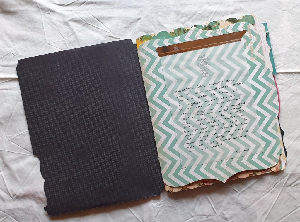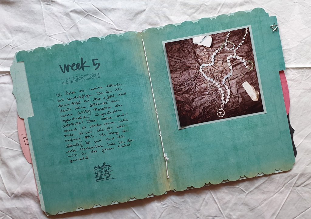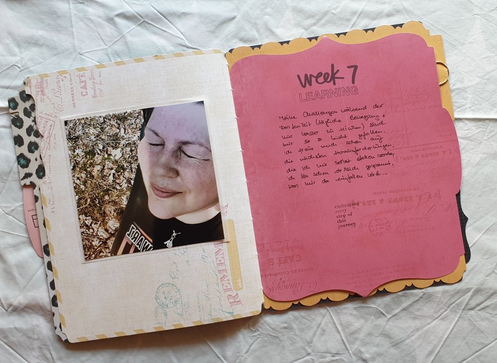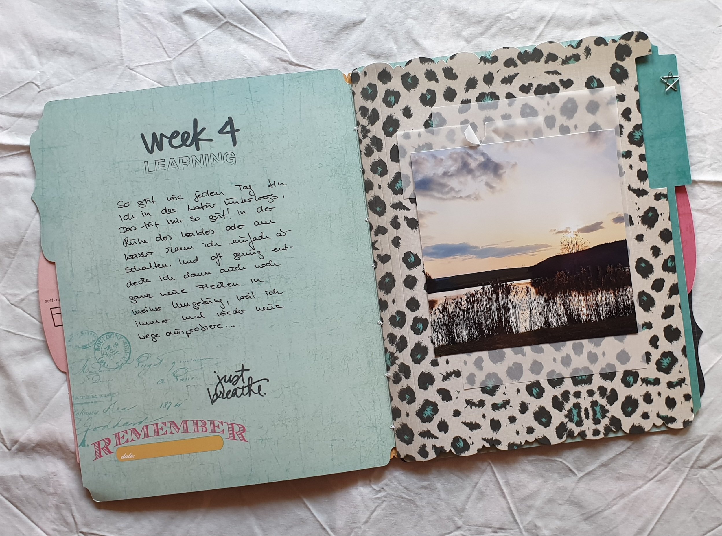 In den wenigsten Wochen habe ich mich beim Journaling explizit mit meinem Hauptthema Wasser trinken beschäftigt, irgendwie ist das ein sehr holistisches Album geworden. Da die Papiere zum Teil sehr auffallend gemustert sind, habe ich die Fotos mit Vellum [Transparentpapier] hinterlegt. Das ist ein Effekt, der meinem cleanen Stil sehr zupass kommt. Das Album, bzw. dessen Einzelteile, habe ich online geordert. Hätte ich z. B. das wilde Blütenmuster vorher real gesehen – wer weiß, ob ich dann zugeschlagen hätte…