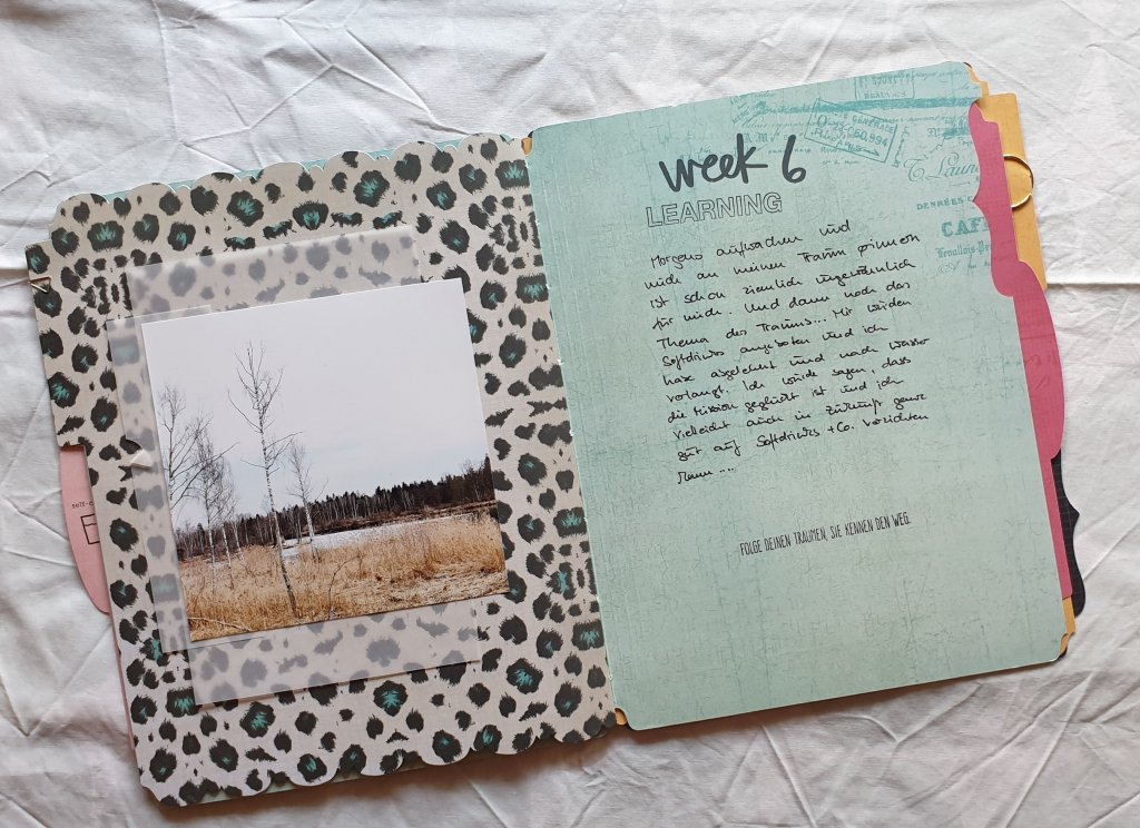Mit dem gesünderen Lifestyle ging auch viel Bewegung einher sowie das Testen neuer Rezepte. Ich habe versucht, immer den gleichen Style in meinem File Folder Album von Heidi Swapp beizubehalten. Oben die Woche gestempelt, darunter das Wort LEARNING. Unten auf der Textseite dann noch einen Stempel. Die meisten verwendeten Stempel sind von Ali Edwards. Ihre Handschrift und auch die Stempel selbst gefallen mir aktuell besonders gut.