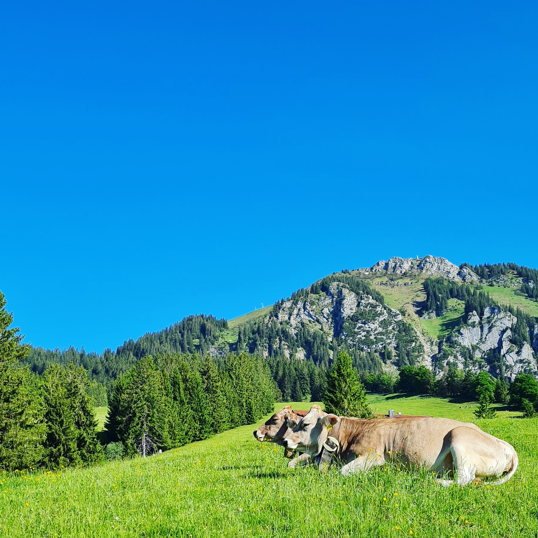 Unten auf der Alpe gab es dann noch Erfrischungen für uns – ich hatte mich den gesamten Abstieg auf meine Apfelschorle gefreut! Und die war sowas von lecker… Für uns ging es dann noch weiter hinab bis zur Bier Alpe, wo wir das Auto geparkt hatten. Dabei entstand dann auch das hübsche Bild mit dem Braunvieh direkt vor dem Grüntenpanorama.