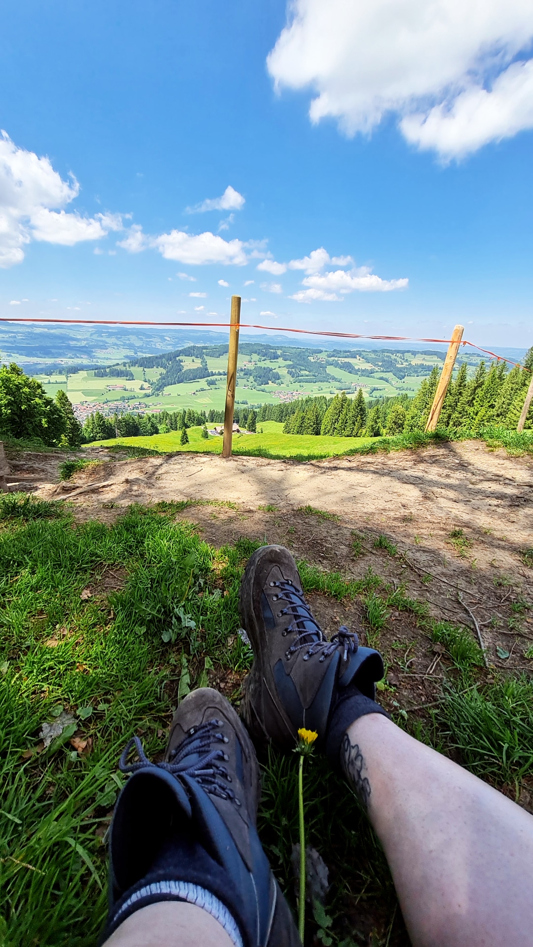 Werbung ohne Auftrag. Mit meinen bewährten Mitwanderern war ich vor kurzem auf einer Halbtagestour auf den Wächter des Allgäus, den Grünten. Dieses Mal ging es erst mittags los, da mein Schwager Nachtschicht hatte und erst noch einige Stunden schlief. An dem Sonntag war es richtig warm und ich hab dieses Mal drauf verzichtet, mit den Beiden mithalten zu wollen. Klare Ansage von mir war nach bereits wenigen Metern oberhalb der Alpe: „Lauft ihr voraus, ich pack das heute nicht. Ich mach in meinem Tempo und entweder treffen wir uns irgendwo am Berg oder dann wieder auf der Alpe.“ Ich hätte keine Chance gehabt, wäre ich bei den beiden geblieben und ihnen hätte es bestimmt auch wenig Spaß gemacht. Tatsächlich hatten wir zu dem Zeitpunkt bereits ungefähr die Hälfte der Wegstrecke bis hoch zum Gipfel hinter uns, jedoch machten mir heute vor allem die Höhenmeter zu schaffen. Auf die Frage der kleinen Schwester, wie viele Höhenmeter es denn noch seien, kam vom Schwager nur die trockene Antwort: „Diese Information könnte Teile der Bevölkerung verunsichern…“