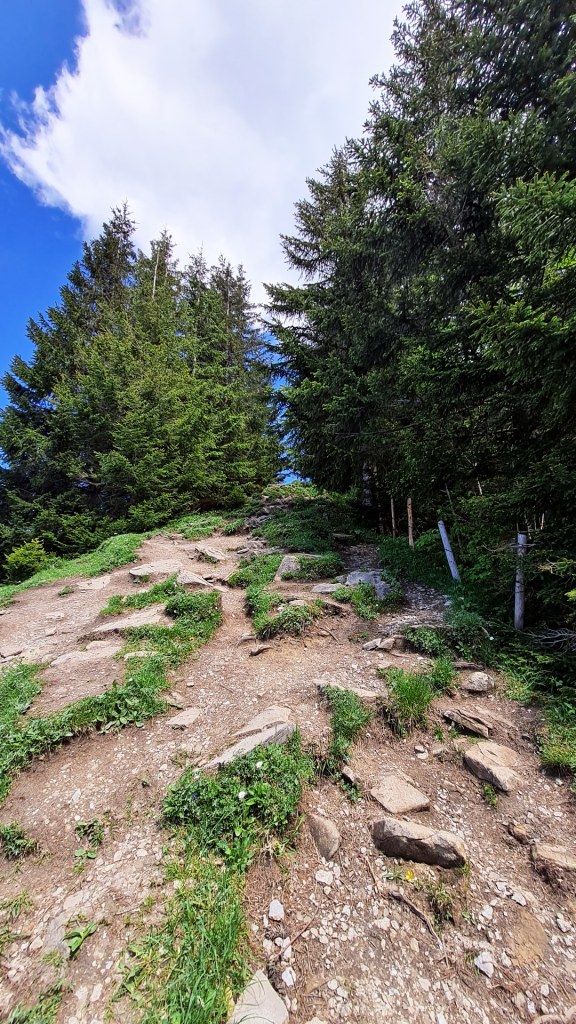 Unterhalb des Gipfels [laut meinem Schwager sind es von diesem Punkt noch 700 m] lud mich eine Bank zum Verweilen ein. R. hat mich kurz danach informiert, dass sie jetzt den Abstieg beginnen, daher habe ich mich gegen einen finalen Aufstieg entschieden. Das war für mich völlig in Ordnung; ich bin mit mir völlig im Reinen, nicht bis ganz oben gegangen zu sein. An einem anderen Tag oder wenn wir bereits morgens gestartet wären, hätte ich es vermutlich locker geschafft.