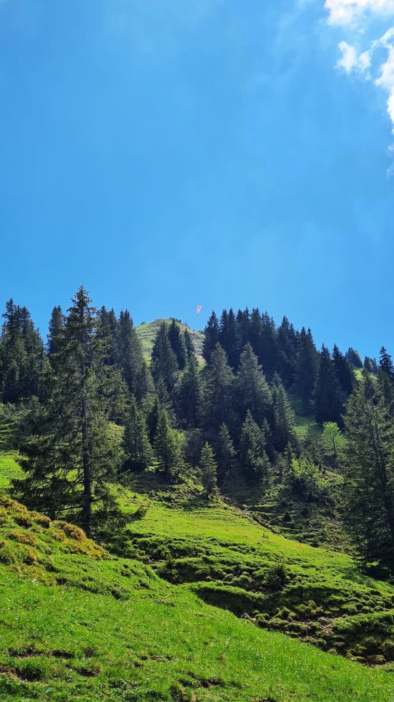 Immer weiter bergauf ohne große Erholungsphasen geht es hier. Dennoch entschuldigt der Anblick des Gipfels für alle Anstrengungen. Von dort starten einige Gleitschirmflieger, die das tolle Wetter natürlich auch ausnützen wollen. Ich bin richtig stolz auf mich, wie weit ich es zu dem Zeitpunkt schon geschafft habe, während die beiden anderen bereits auf dem Gipfel sind. Ich hatte nämlich schon ein richtig schönes Bild von ganz oben erhalten.