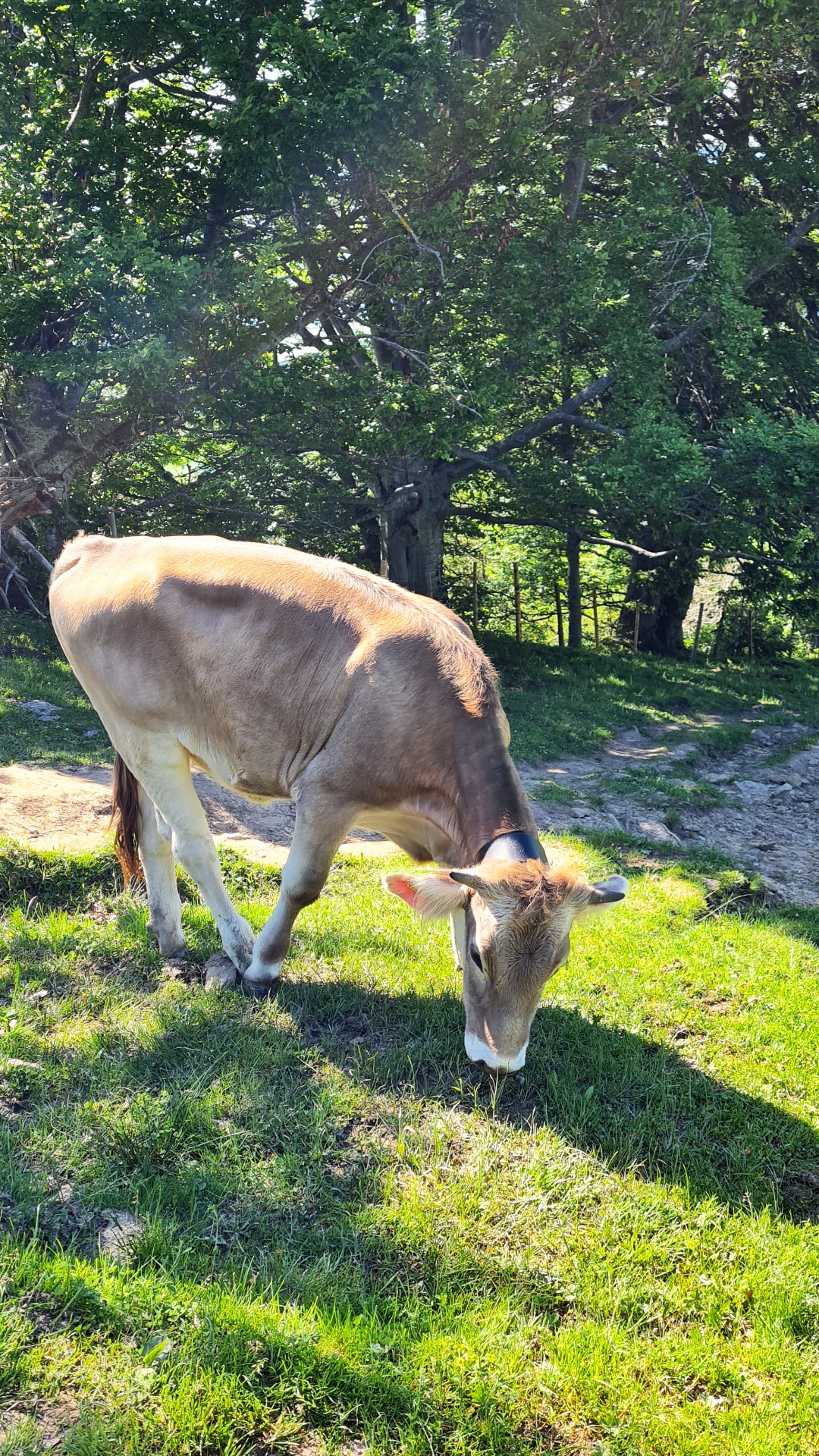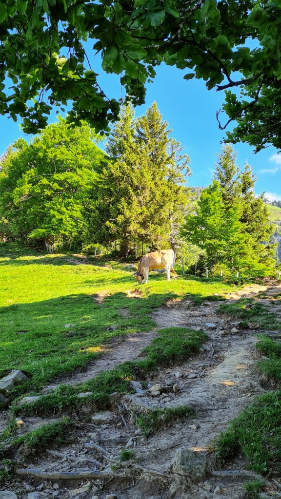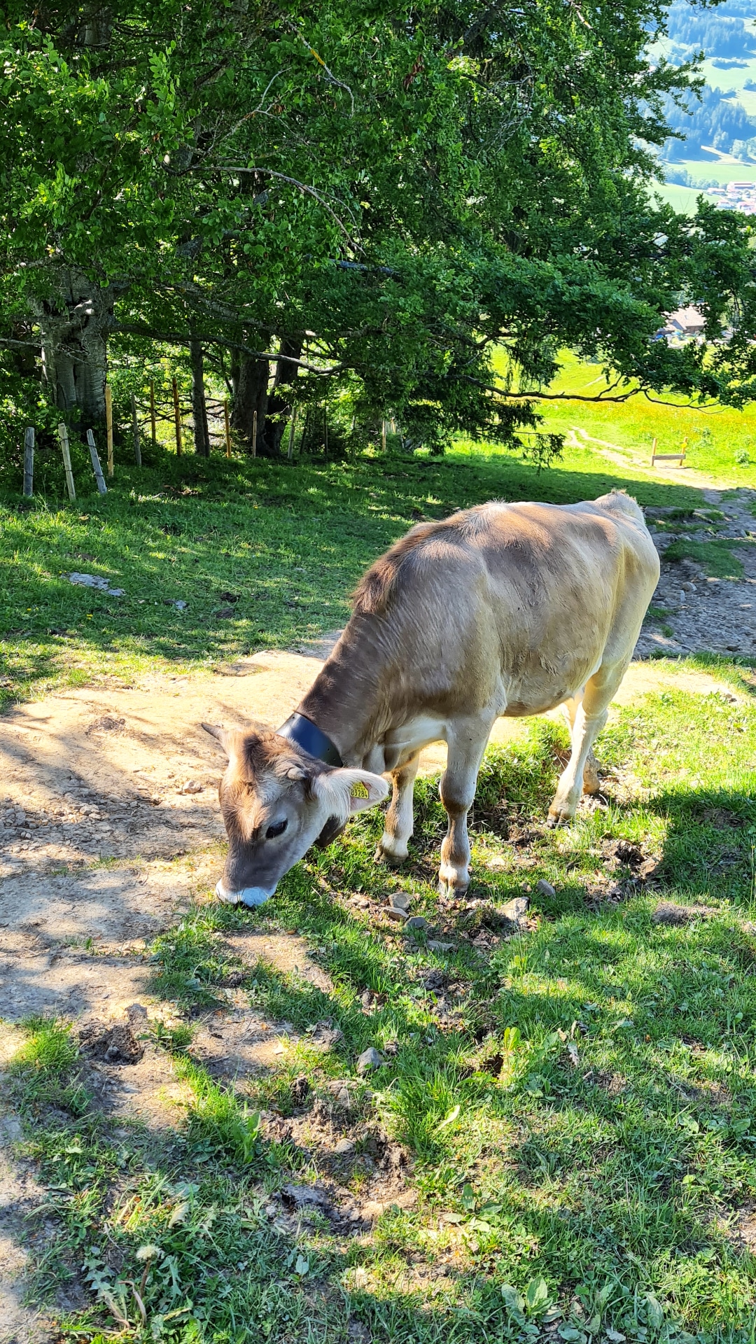 Beim Abstieg hinab zur Alpe hatte ich dann auch endlich die Möglichkeit, das Braunvieh auf den Weiden zu fotografieren. Mittags lagen die Tiere nämlich nur völlig ermattet im Gras und käuten wieder. Jetzt in den etwas kühleren Stunden bimmelte es aus allen Himmelsrichtungen von den Kuhglocken.
