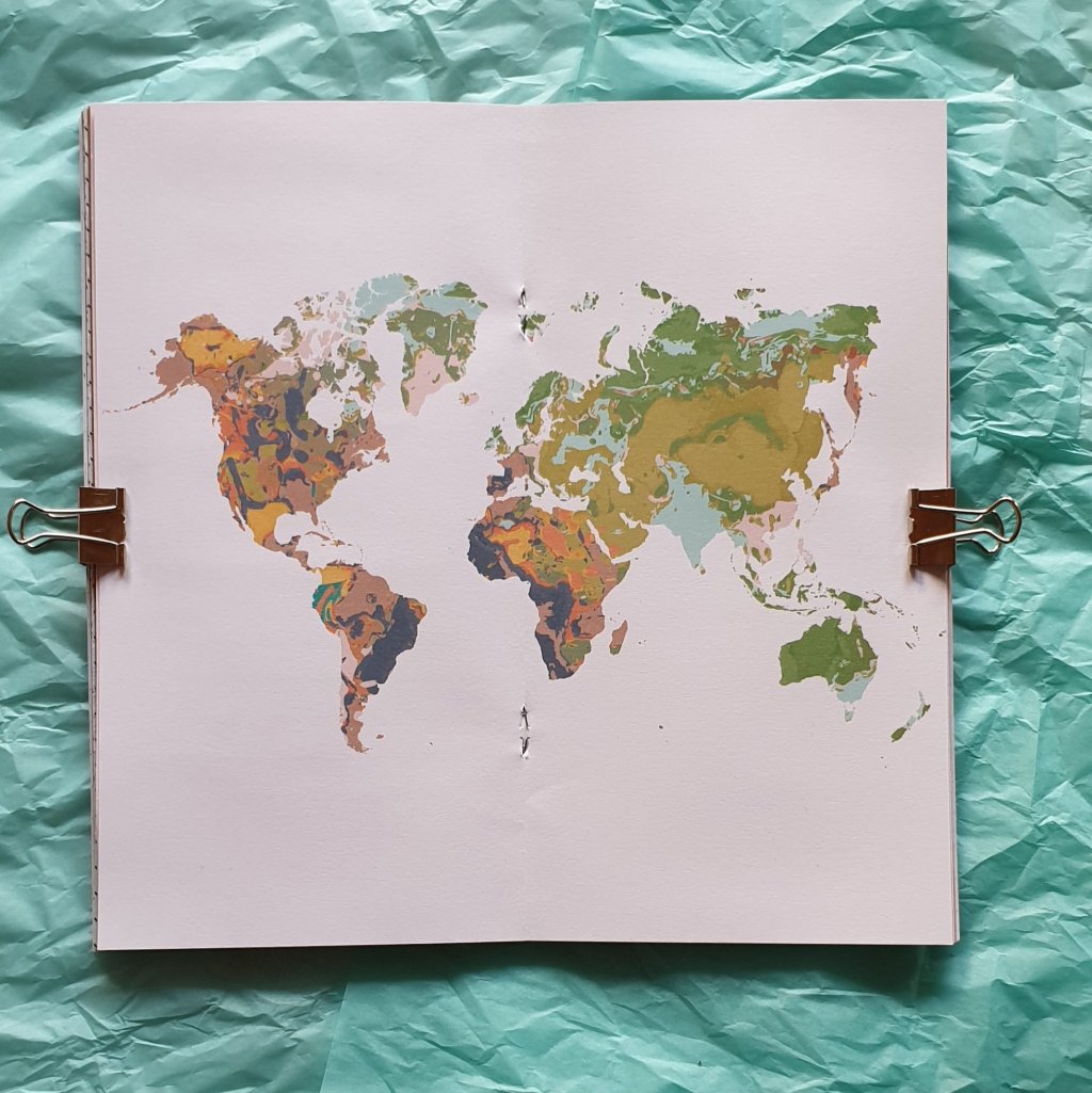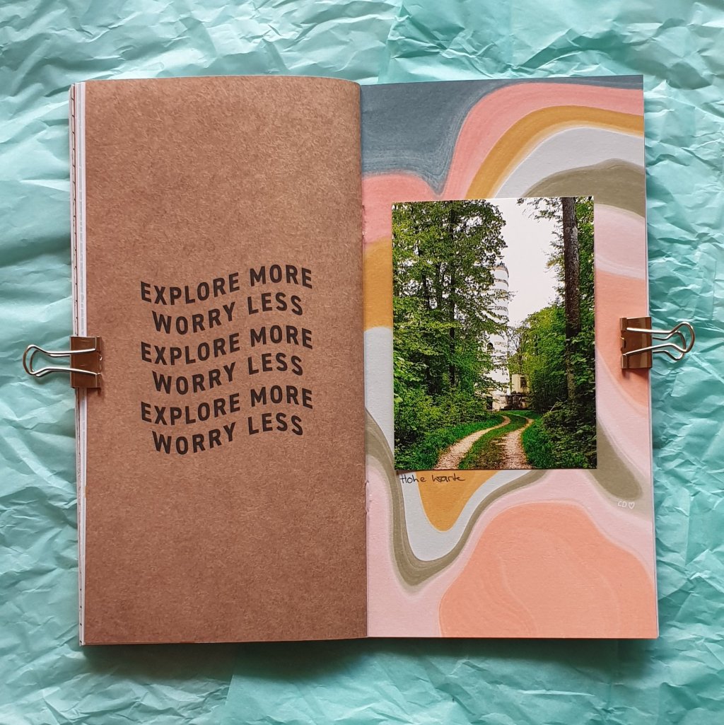 Im gesamten Notebook waren bereits farbige bzw. gemusterte Papiere vorhanden, die ich durch Stempelabdrücke der unterschiedlichsten Hersteller ergänzte. Das Albumcover habe ich mit einem Bild und einem thematisch passenden Spruch bestempelt. Eigentlich war der Plan, den Ort Bad Urach in dem freien Feld festzuhalten, aber alles war irgendwie nicht stimmig – entweder war Größe oder Schriftart nicht nach meinem Gusto….