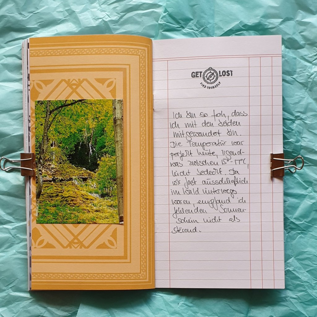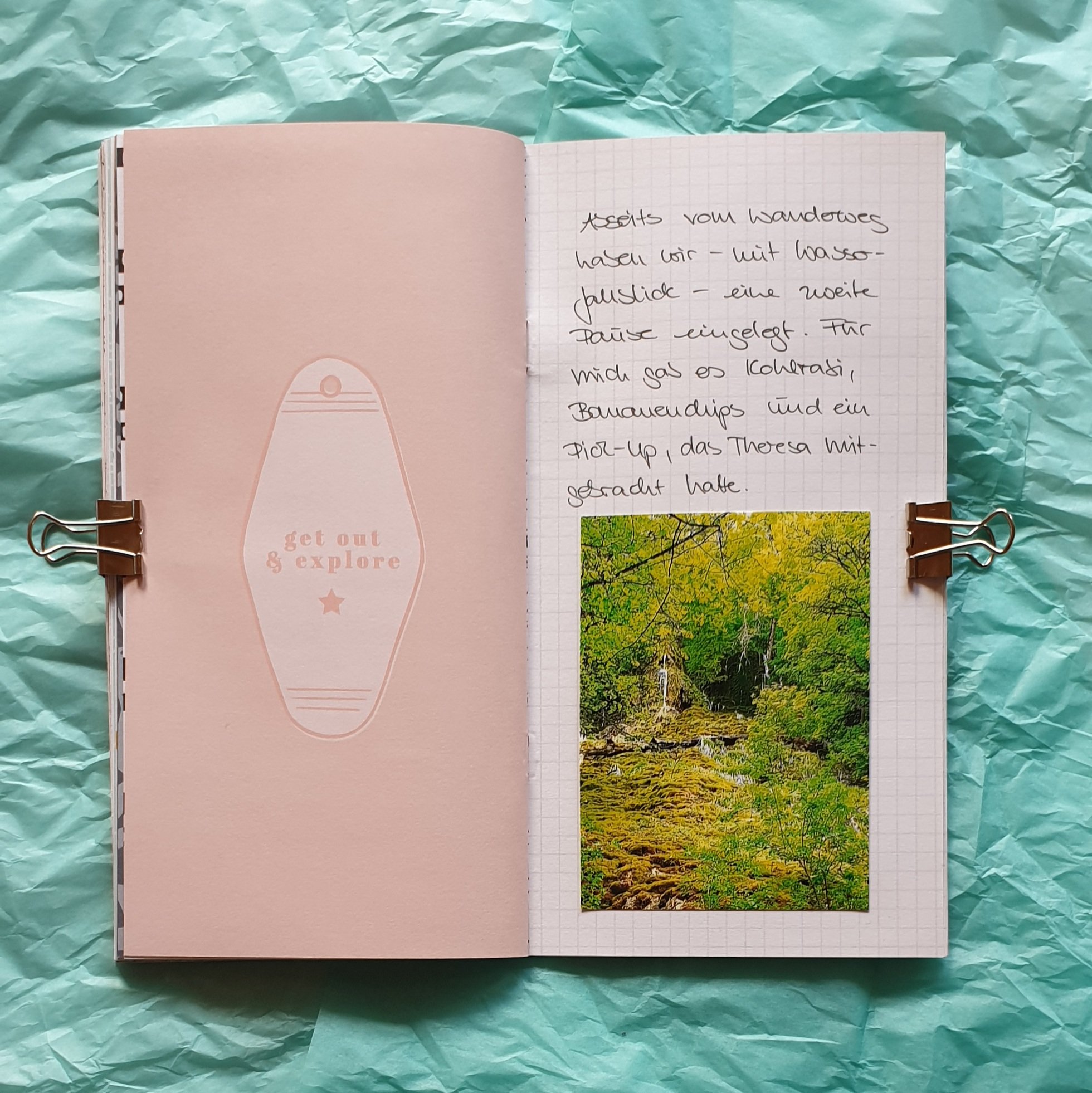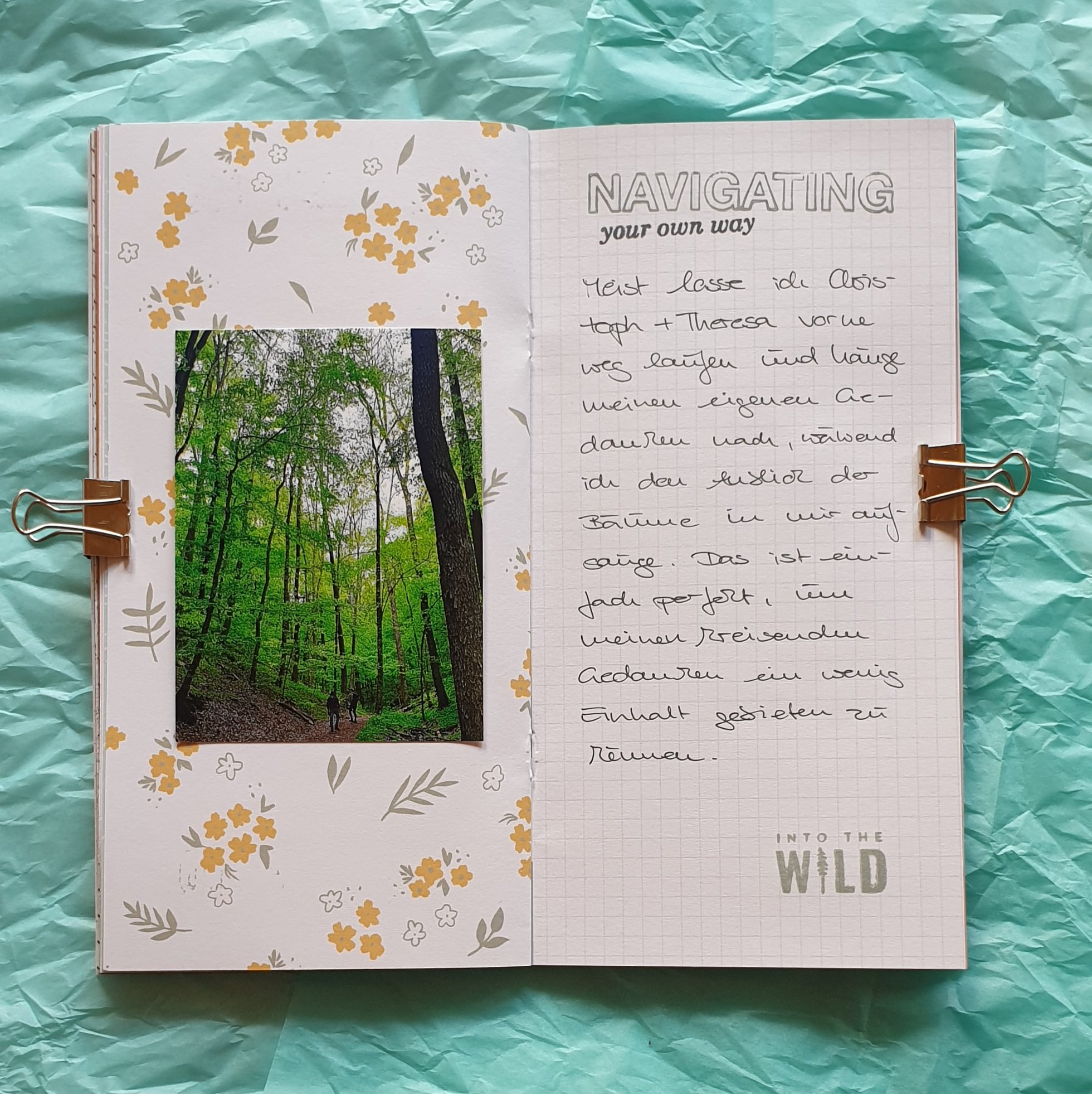 Mein Fokus in diesem Notizbuch liegt voll auf den Bildern und meinem Journaling. Gestempelt habe ich in schwarz bzw. einem Grüngrau [Distress Oxide Iced Spruce / Tim Holtz], das sehr schön mit den Papieren harmoniert. Die verwendeten Stempel sind von Studio Calico, Ali Edwards, Papierprojekt und Dani Peuss. Tatsächlich gefallen mir die englischsprachigen Stempel oftmals viel besser als welche mit deutschem Text, aber hier war das durchaus stimmig.