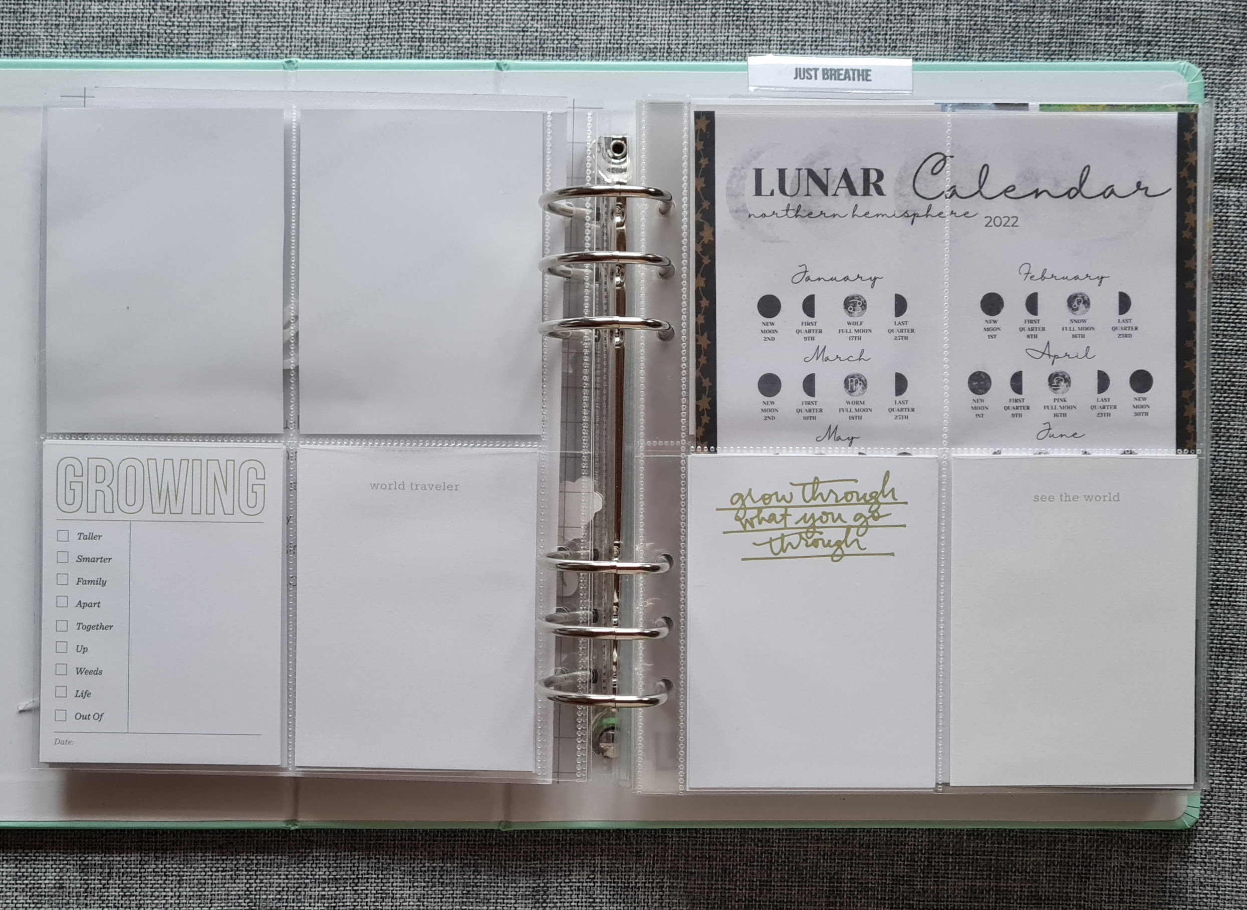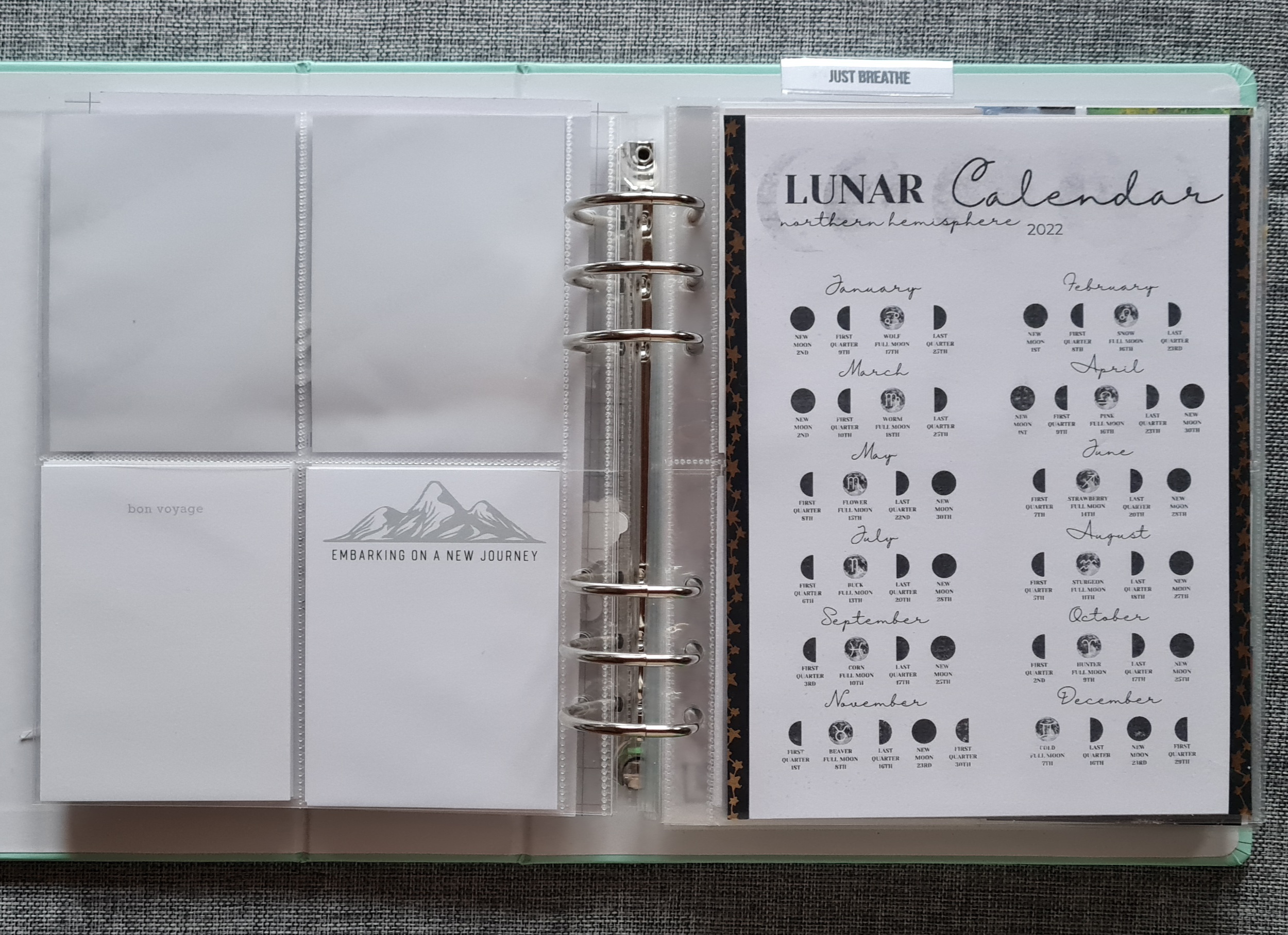 Als kleines Goodie habe ich mir bei Etsy eine digitale Datei mit den Mondphasen bzw. mit dem Mondkalender gegönnt. Ich mag es, mich mit verschiedenen, neuen Dingen zu befassen – der Einfluss des Mondes auf unser Leben gehört dazu. Auf der Rückseite dessen und als Abschluss meines persönlichen Introbereichs habe ich Designpapier mit dem schönen Ginkgo-Motiv passend zugeschnitten. Dazu kupferfarbene Sticker und ich bin sehr zufrieden damit.