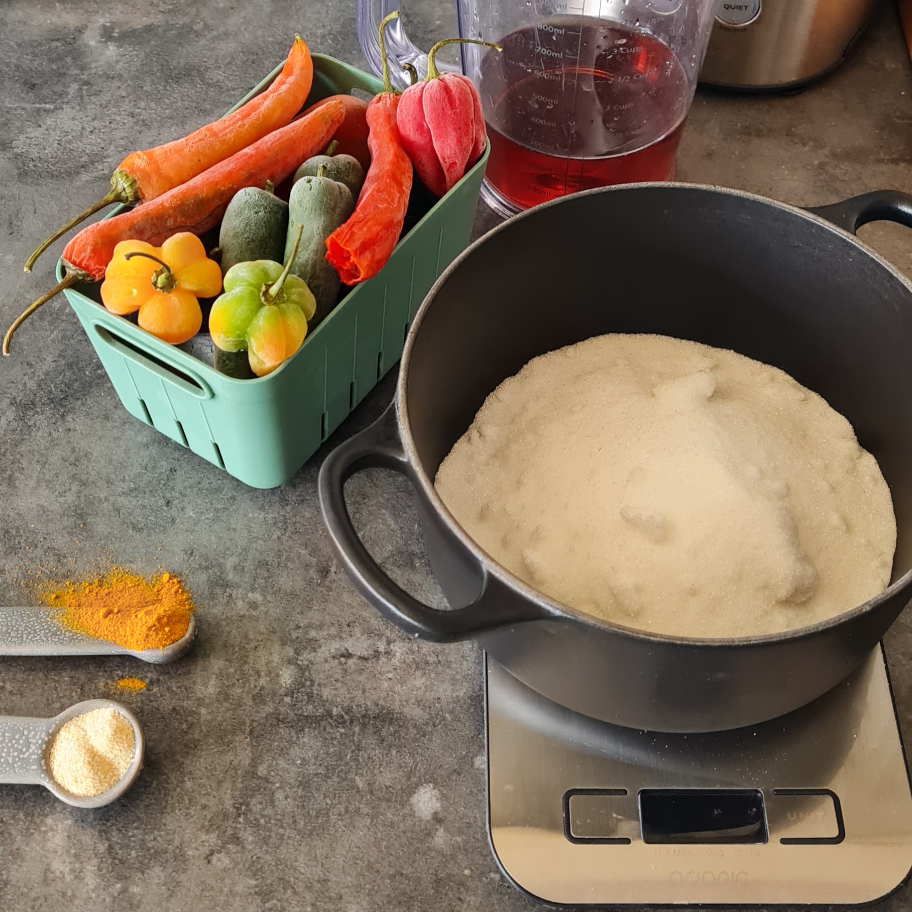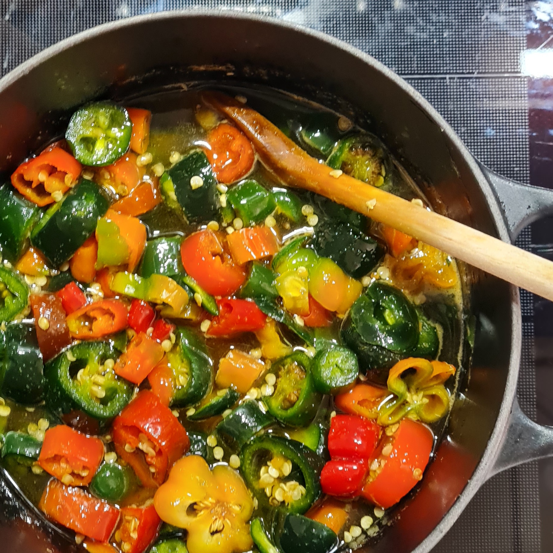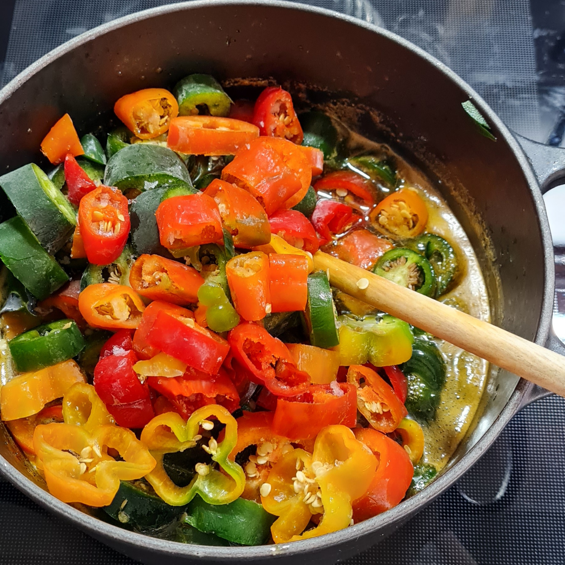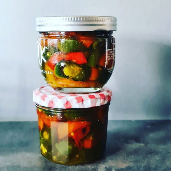 Ich habe mir ein Rezept einer deutschen Seite, die sich auf Chilis spezialisiert hat, gegooglet und mal die Hälfte der angegebenen Mengen verwendet – mehr Chilis hatte ich nämlich nicht und ich musste schon teilweise mit anderen Sorten ergänzen… Es war tatsächlich ziemlich aufwändig, an Jalapeños zu kommen und so habe ich über Wochen beim örtlichen Edeka immer mal wieder ein Päckchen mit ganzen zwei [!] Jalapeños ergattern können, welche dann im Gefrierschrank auf ihren spektakulären Einsatz warten mussten… zwischenzeitlich habe ich online einige Chilipflanzen bestellt, um im Sommer jede Menge Köstliches damit zu fabrizieren.