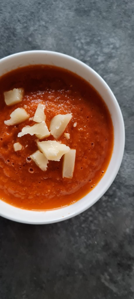 Währenddessen Parmesan in Stücke brechen. Die Tomatensuppe in einen Standmixer geben und fein pürieren. Bei Bedarf noch etwas Wasser hinzugeben oder im Topf auf die gewünschte Konsistenz einkochen lassen. In Schalen füllen, mit dem Parmesan bestreuen und servieren.