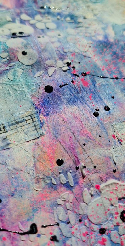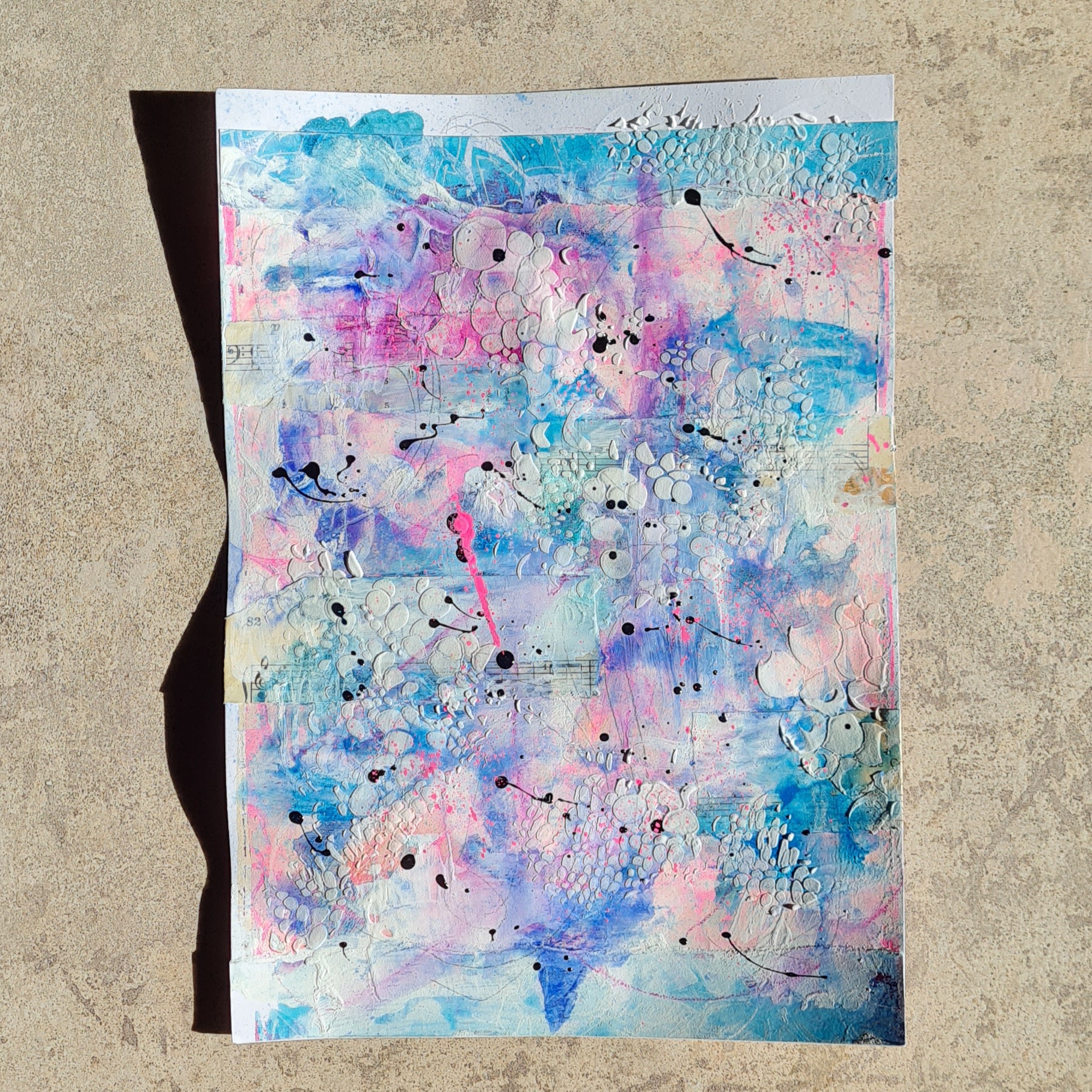 Ich habe Notenblätter für Collage, Gesso, Aquarellfarben, -kreide, Chinamarker, Modelling Paste, Acrylmarker und Bleistift verwendet. Zusätzlich habe ich auch mal wieder meinen irRESISTible-Spray verwendet. Leider musste ich feststellen, dass er Schwarze mittlerweile vertrocknet ist. So habe ich nun eben den Grauen verwendet.