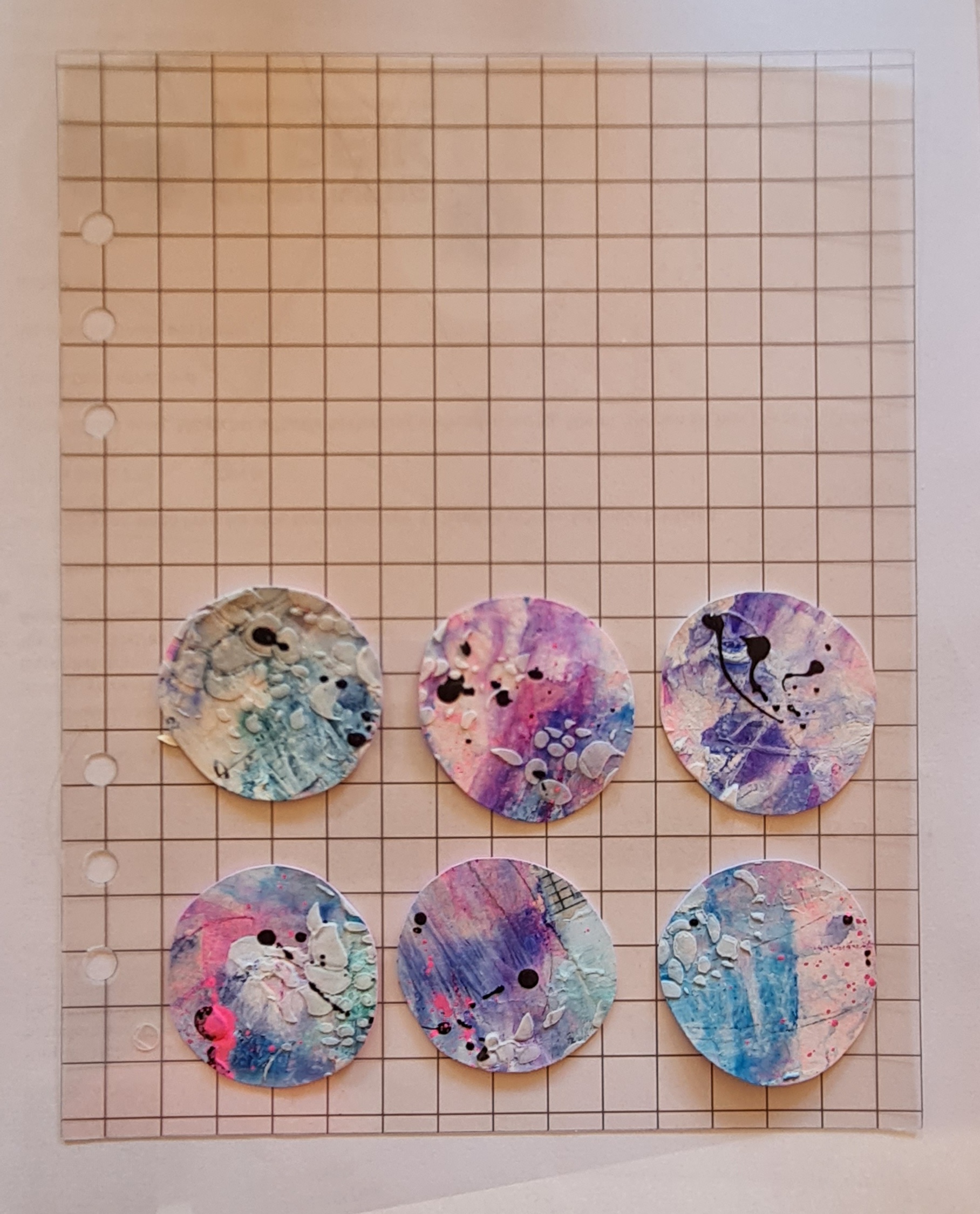 Meine wonky circles – also schiefen Kreise habe ich dann auf unterschiedlichen Transparencies [Acrylfolie] ausgelegt. Ich war mir im Vorfeld nicht so sicher, was am Besten wirken könnte. Schlussendlich entschied ich mich für den stärksten Kontrast. Schwarzes Karo gefällt mir richtig gut, das hatte ich auch schon bei meiner Startseite ins Album so gestaltet.