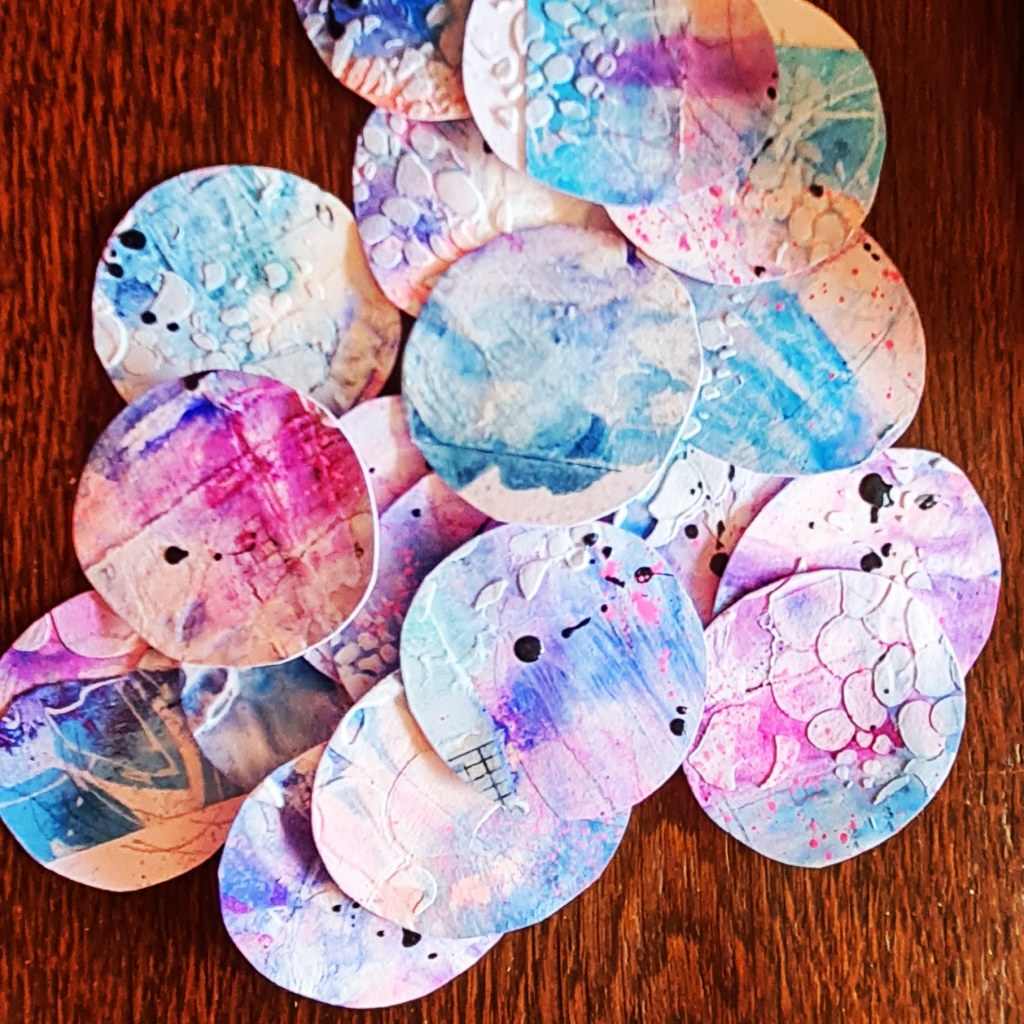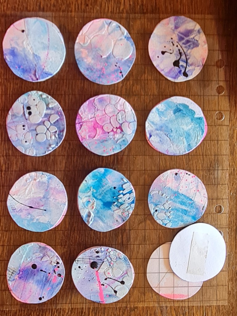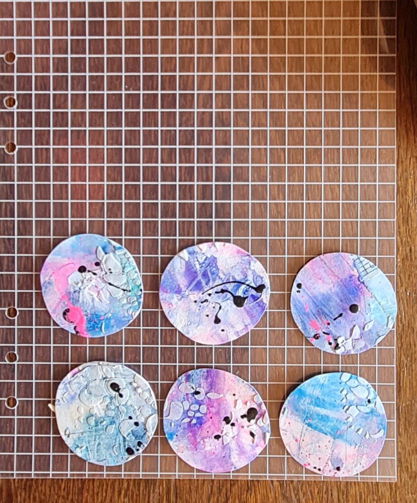 Meine kleinen Siege habe ich mit einer tollen Schriftart gemacht – die Labels, die mit einem Labelmaker gestaltet werden, waren meine Inspiration. Das wäre jedoch viel zu groß und wuchtig gewesen. Also habe ich fix in der Mittagspause die passende Schriftart runtergeladen und die entsprechenden Texte getippt, ausgedruckt und zugeschnitten. Mit Glossy Accents habe ich die kleinen Textstreifen dann auf den Kreisen befestigt.