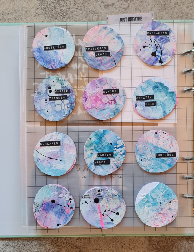 Auf der zweiten Seite blieben unten drei Kreise über. Zwischenzeitlich habe ich auf den linken und mittleren noch einen Acrylschriftzug von Ali Edwards geklebt. Dieser sagt „just breathe“. Genau richtig, ist mein Wort 2022 doch Breathe. Ich überlege noch, etwas auf den verbliebenen leeren Kreis zu schreiben, wahrscheinlich bleibt dieser jedoch frei.