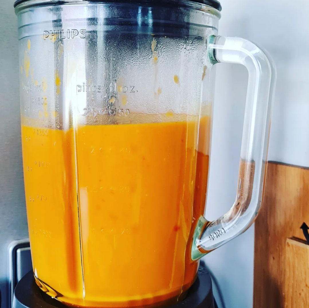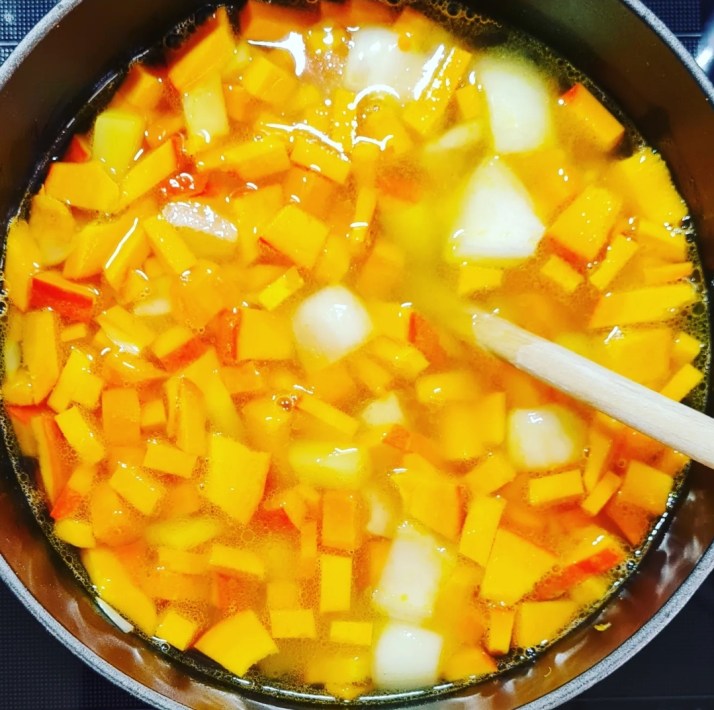 Für meine Basis-Kürbissuppe kamen neben einem kleinen Hokkaido-Kürbis Linsen, Paprika, Karotten, Zwiebeln und Kartoffeln zum Einsatz. Die Zwiebel habe ich relativ grob, das feste Gemüse jedoch kleinstmöglich gewürfelt. So gart es schneller und die Suppe kann auch mal in der Home Office Mittagspause frisch gekocht werden. Nach dem Andünsten in etwas Öl kommen die roten Linsen mit in den Topf. Das Gemüse mit kaltem Wasser bedecken und weich kochen. Erst nach dem Garen würzen, denn die Linsen bleiben fest, wenn dem Essen Säure oder Salz zugefügt wird…