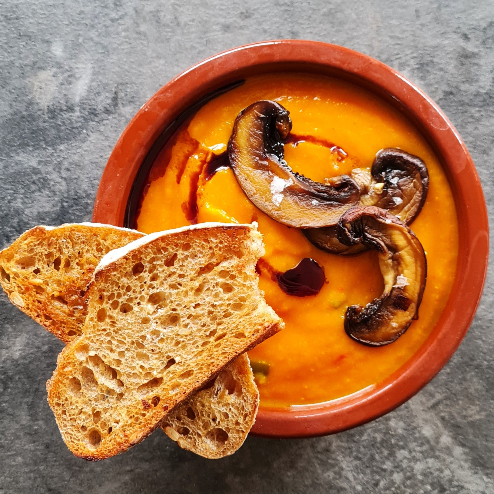 Sobald die Suppe gar ist, mit dem Zauberstab oder im Standmixer pürieren. Zurück in den Topf geben und bei Bedarf mit weiteren Flüssigkeit auf die gewünschte Konsistenz strecken. Mit Zitronensaft abschmecken und zum Servieren auf jeden Teller etwas Kürbiskernöl und gebratene Pilze geben.