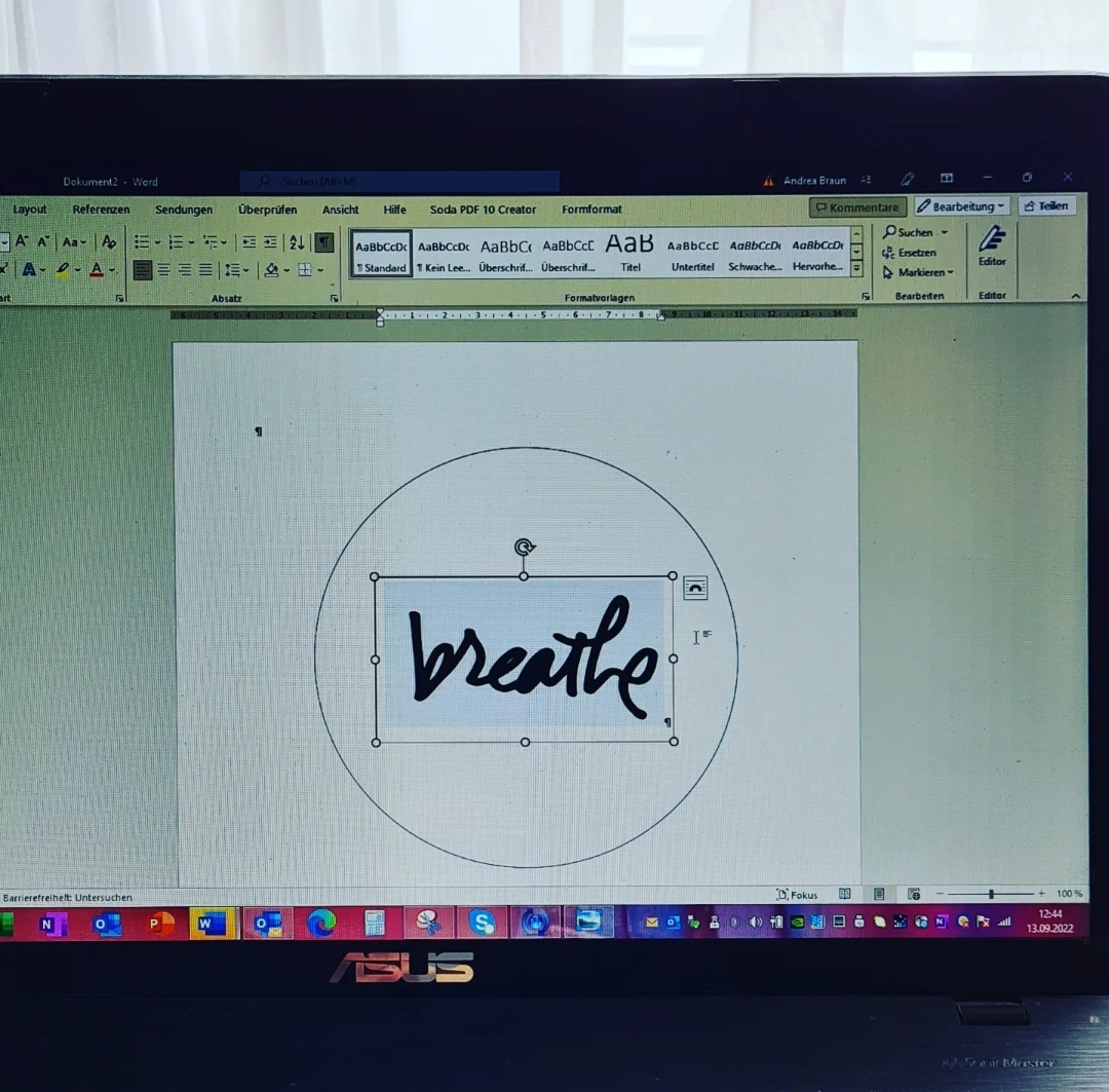 Zuerst den gewünschten Stickrahmen ausmessen [in meinem Fall13 cm] und im Textverarbeitungs-programm einen passenden Kreis aufziehen. Nur die Kontur stehen lassen, die Option „ohne Füllung“ auswählen. Das gewünschte Motiv wie in meinem Fall der Schriftzug, der eigentlich ein digitaler Stempel ist, abspeichern und evtl. screenshotten. In die vorhandene Form ein Textfeld einfügen und den Schriftzug über Copy / Paste einfügen. Das Motiv in der Größe anpassen und platzieren.