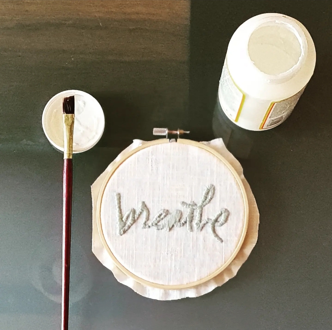 Für solche Arbeiten mag ich am liebsten Mod Podge. Der Kleber trocknet transparent auf und lässt sich schön mit dem Pinsel auftragen. Trotz des dünnen Materials ist er auch nicht komplett durch den Stoff gedrungen.