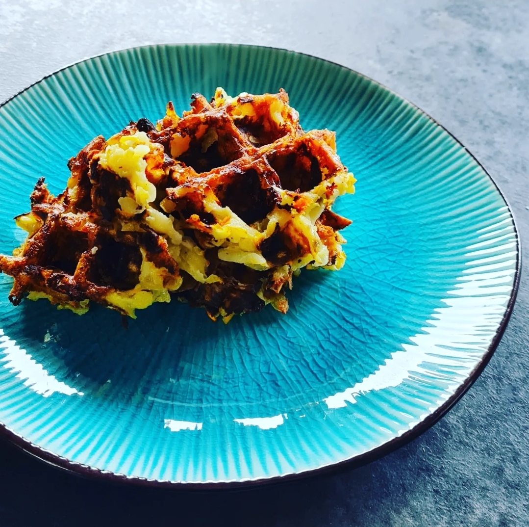 Die Kartoffelmasse mit Salz und Pfeffer würzen und das Ei unterrühren. Mit einem Löffel die Kartoffel-Käse-Mischung gleichmäßig im Waffeleisen verteilen und langsam backen lassen. Zwischendurch gerne auch mal prüfen, ob die Rösti schon gar sind oder noch etwas Zeit benötigen. Mit einer Gabel aus dem Waffeleisen nehmen.