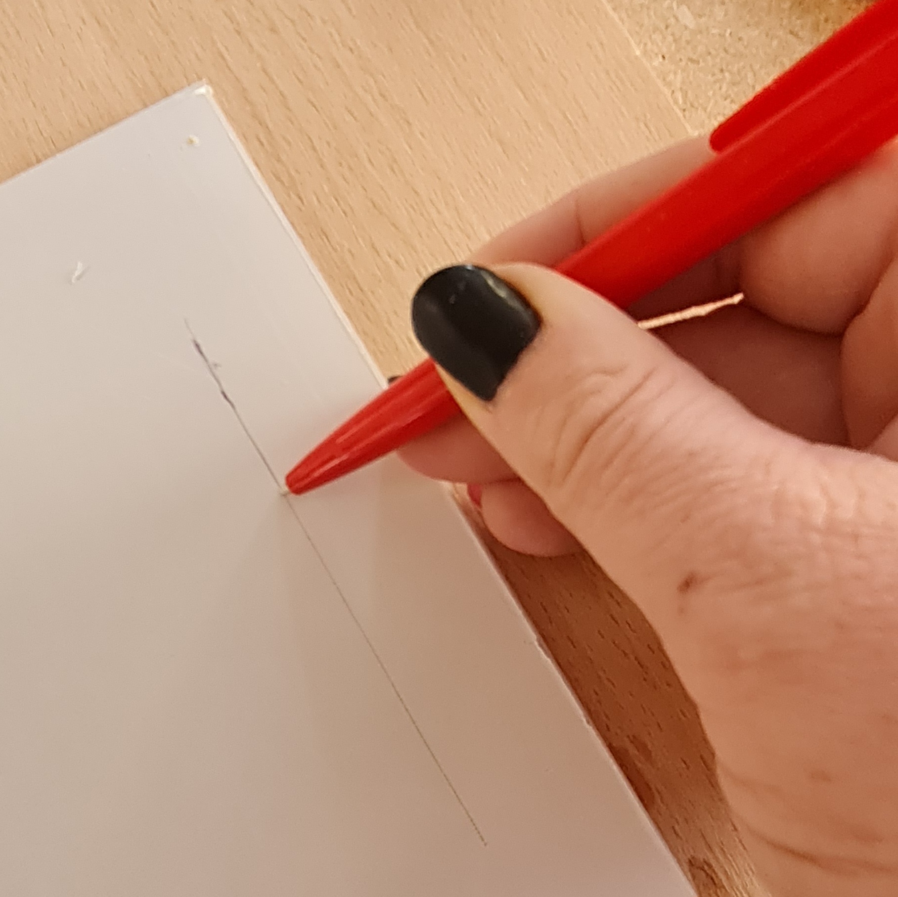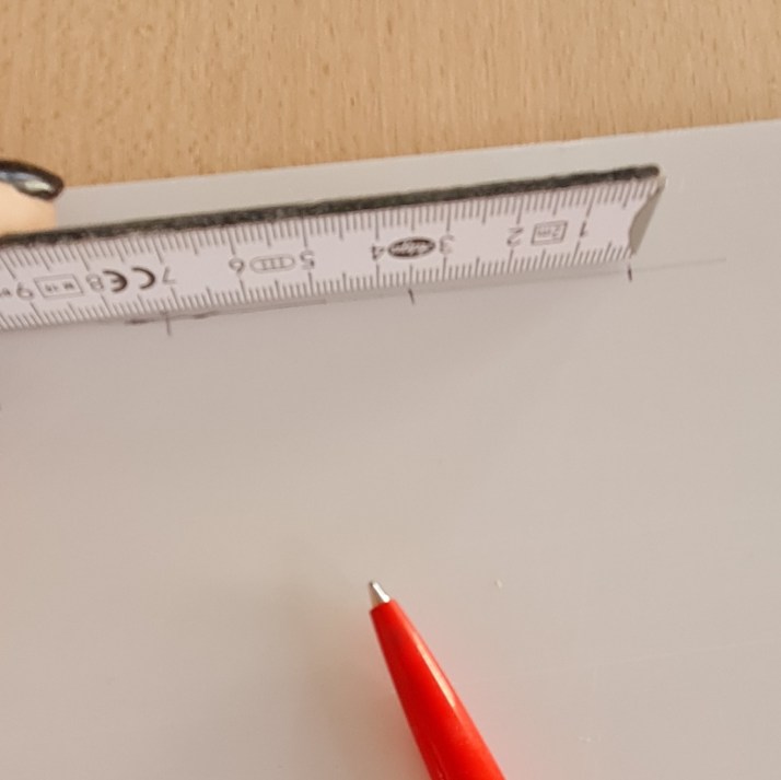 Im gewünschten Abstand parallel zu einer kurzen Seite eine Linie mit Kugelschreiber ziehen. Diese ist die Mitte, auf der später die Bohrungen gesetzt werden. Während dieser und einer Vielzahl der folgenden Schritte die Schutzfolie auf der Plexiglasplatte belassen. Zum Einen wird diese dadurch vor Kratzern geschützt, zum Anderen sind die Markierungen deutlich besser erkennbar.
