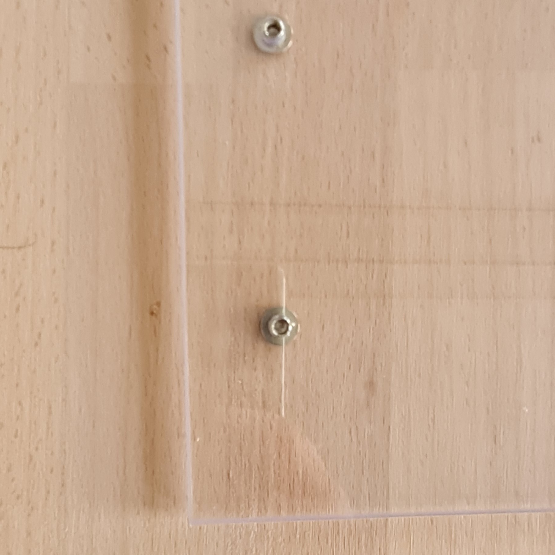 Den Holzbohrer in das Futter der (Akku)Bohrmaschine einspannen, die Plexiglasplatte auf eine Unterlage (beispielsweise ein ausreichend großes Stück Restholz) legen und die Löcher für die Schrauben zur Befestigung langsam und sorgfältig bohren. Wenn Du nicht geübt bist in der Verarbeitung von Plexiglas, dann mache gerne einige Probebohrungen an einem Reststück. Der Bohrer braucht einige Umdrehungen, bis er greift. Die Bügelmechanik zur Kontrolle nochmals auflegen und eventuell abstehende Späne vorsichtig entfernen. Wenn alles passt, kannst Du die Schutzfolie von der Plexiglasscheibe entfernen.