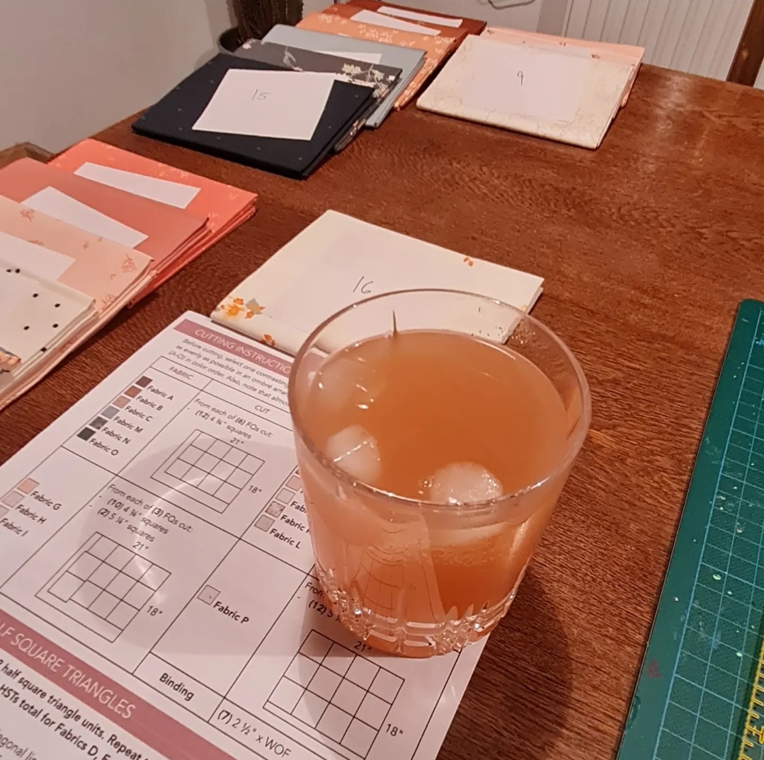 Mein aktueller Lieblingsdrink und dazu der Stoff und die Unterlagen für den nächsten Quilt. Das wird richtig schön herbstlich.