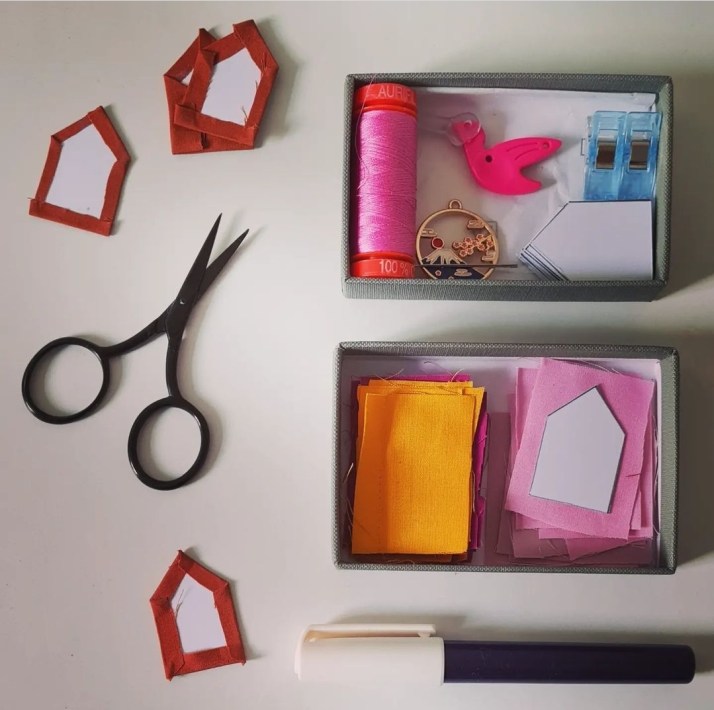Und so sahen die Einzelteile unterwegs aus. Die „Häuschenschablonen“, die zusammengesetzt dann die Pluszeichen ergeben, hatte ich vor meinem ersten Trip zu Hause noch ausgeschnitten und die Stoffstücke einigermaßen vorbereitet. Das Ein oder Andere ist dabei etwas zu schmal geraten, dadurch waren die Näharbeiten dann durchaus tricky…. Zur Vorbereitung fürs Nähen entschied ich mich, mit dem Stoffklebestift zu arbeiten. Manche QuilterInnen heften den Stoff mit Faden um die Schablonen, ich mag das jedoch nicht so gerne… in der kleinen Schmuckschachtel, in der ich alles Spitze verstaut habe, sind meine Schere, der Needleminder in Form des Berges Fuji und Nadeln, zwei Patchworkklammern, Faden von Aurifil und die Stoffe sowie Schablonen gut aufgehoben.