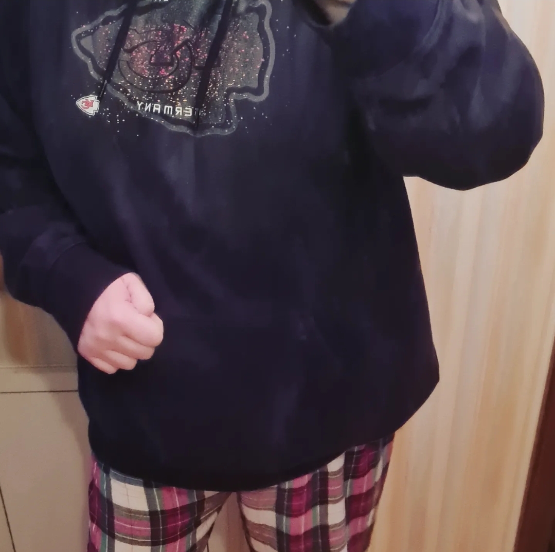 Zu Hause – egal ob im Home Office oder dann am Wochenende – gibt es hier ziemlich bequeme Klamotten. Heute eine irgendwie fragwürdige Kombi aus Weihnachtspyjamahose und einem Hoodie meines liebsten NFL-Teams.