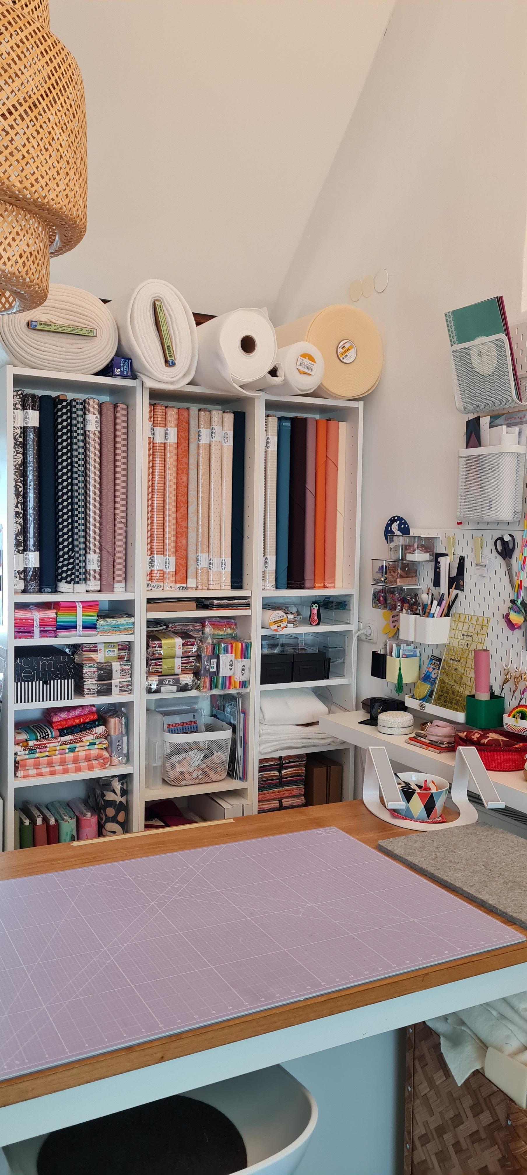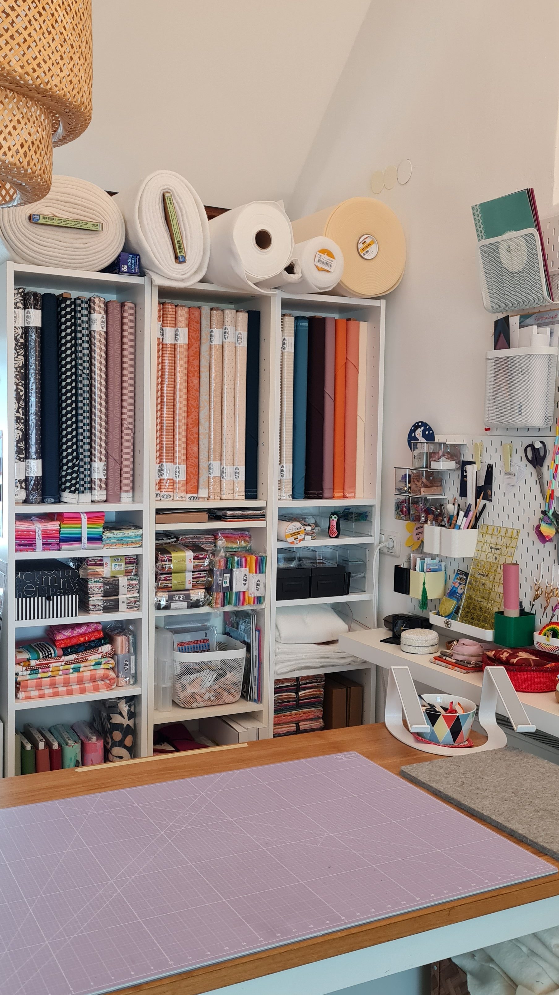 Allein diese tolle Magnetwand! Marta hat sich hier die Möglichkeit geschaffen, verschiedenste Farbkombinationen zusammen zu stellen. Das hätte ich auch gerne…. Schade, dass Hannover gar so weit von meinem Wohnort entfernt ist, sonst würde ich da noch viel viel mehr shoppen…. ich freu mich jedenfalls schon, die Stoffe aus der Duval-Kollektion zu einem Quilttop zu verarbeiten und hoffe, Marta bald mal wieder treffen zu können.