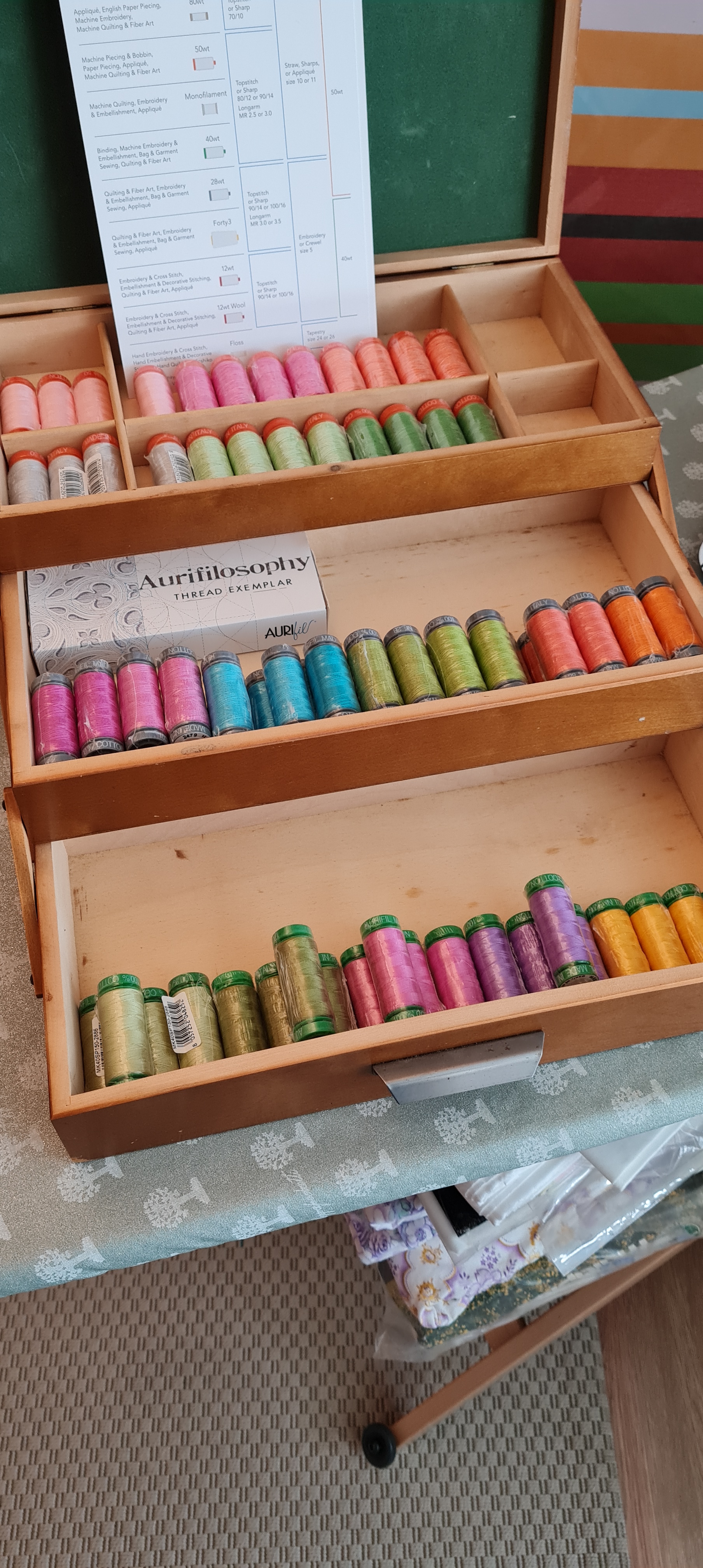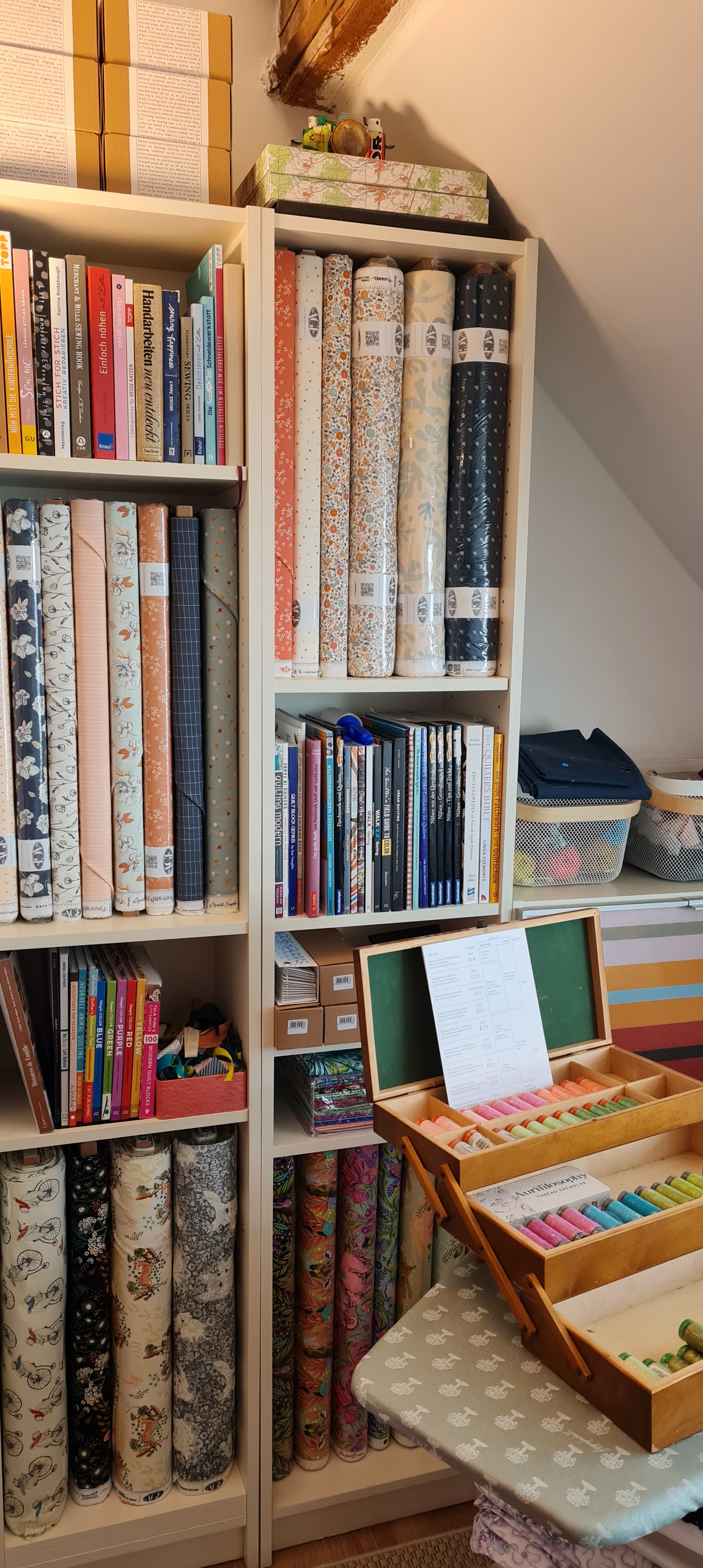 Es macht mir total viel Spaß, die Stoffe „in echt“ anzusehen und anfassen zu können. Auf dem Bild oben rechts sind beispielsweise die Stoffe aus der Duval-Kollektion von Suzy Quilts für Art Gallery Fabrics zu sehen. Diese hätte ich mir niemals geholt, hätte ich diese nur online betrachten können. So jedoch fiel mir die Entscheidung echt leicht 😉