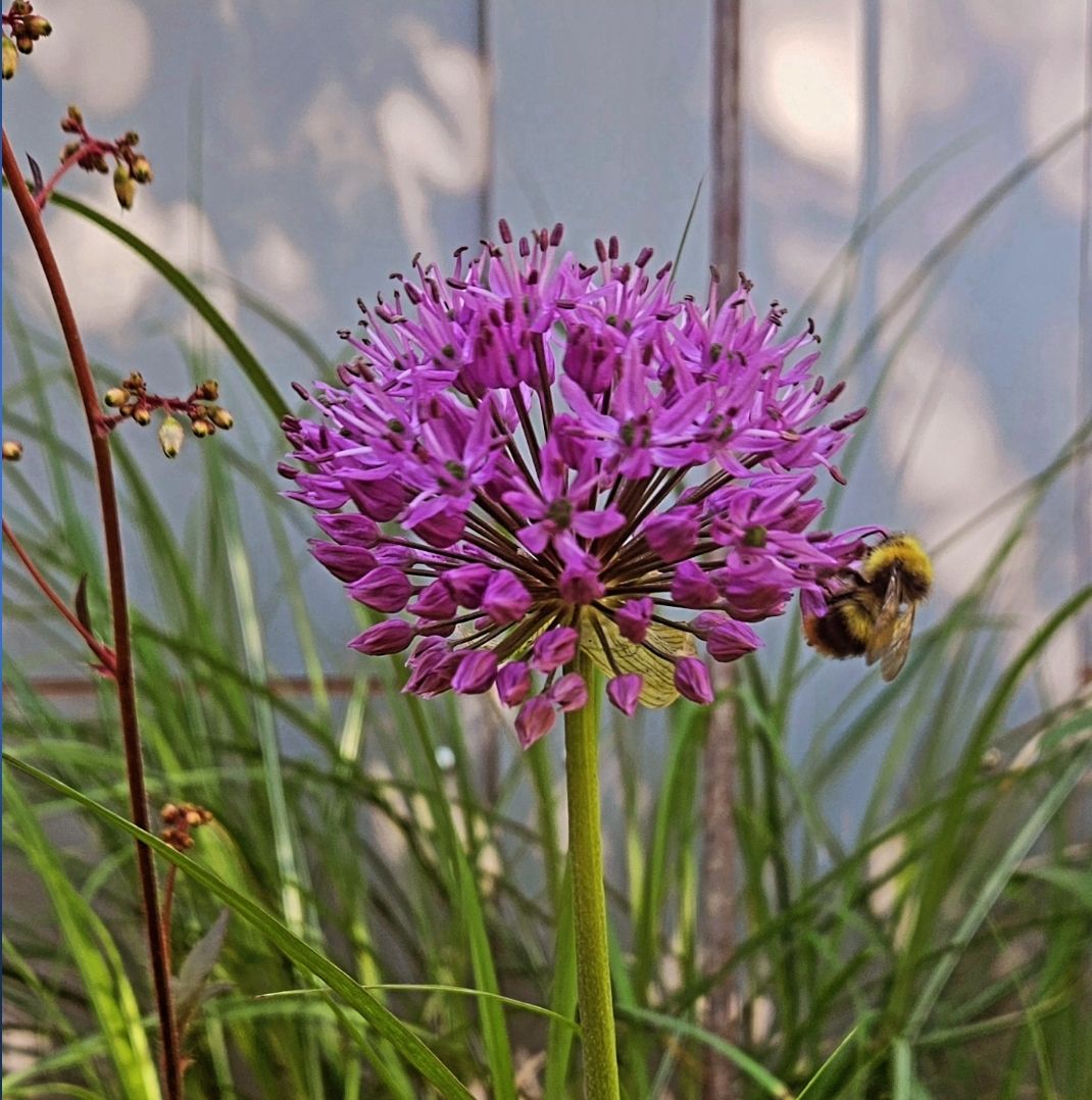 Honigbiene an Zierlauch – im Garten summt und brummt es von frühmorgens bis zum Sonnenuntergang.