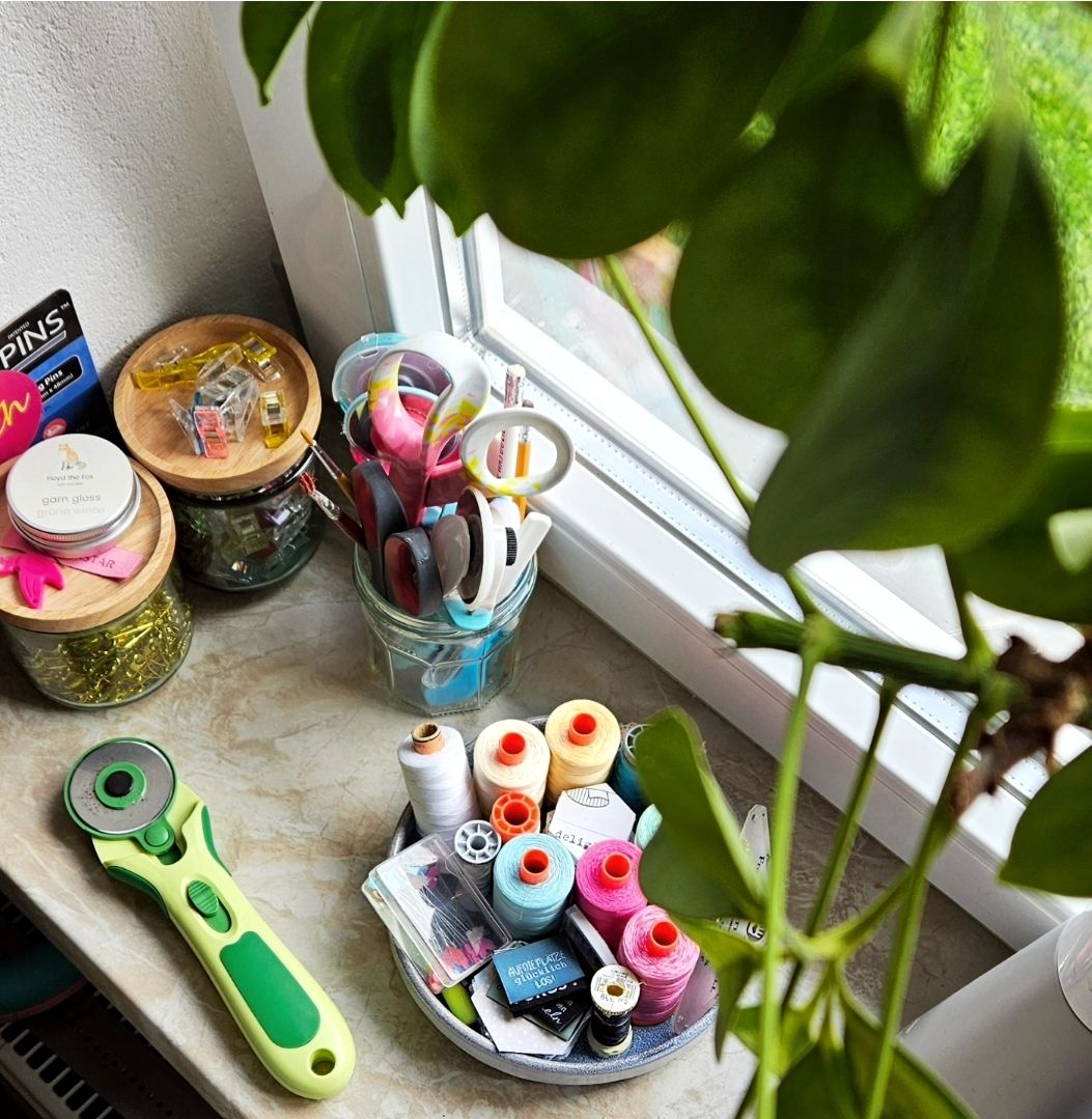 Fensterputzen und dann die wichtigsten Nähutensilien zurück aufs Fensterbrett… seit gut einem Jahr nähe ich im Erdgeschoss, weil ich mich auf dem Tisch in der Küche echt gut ausbreiten kann und ein Projekt dort auch mal liegen bleiben darf.