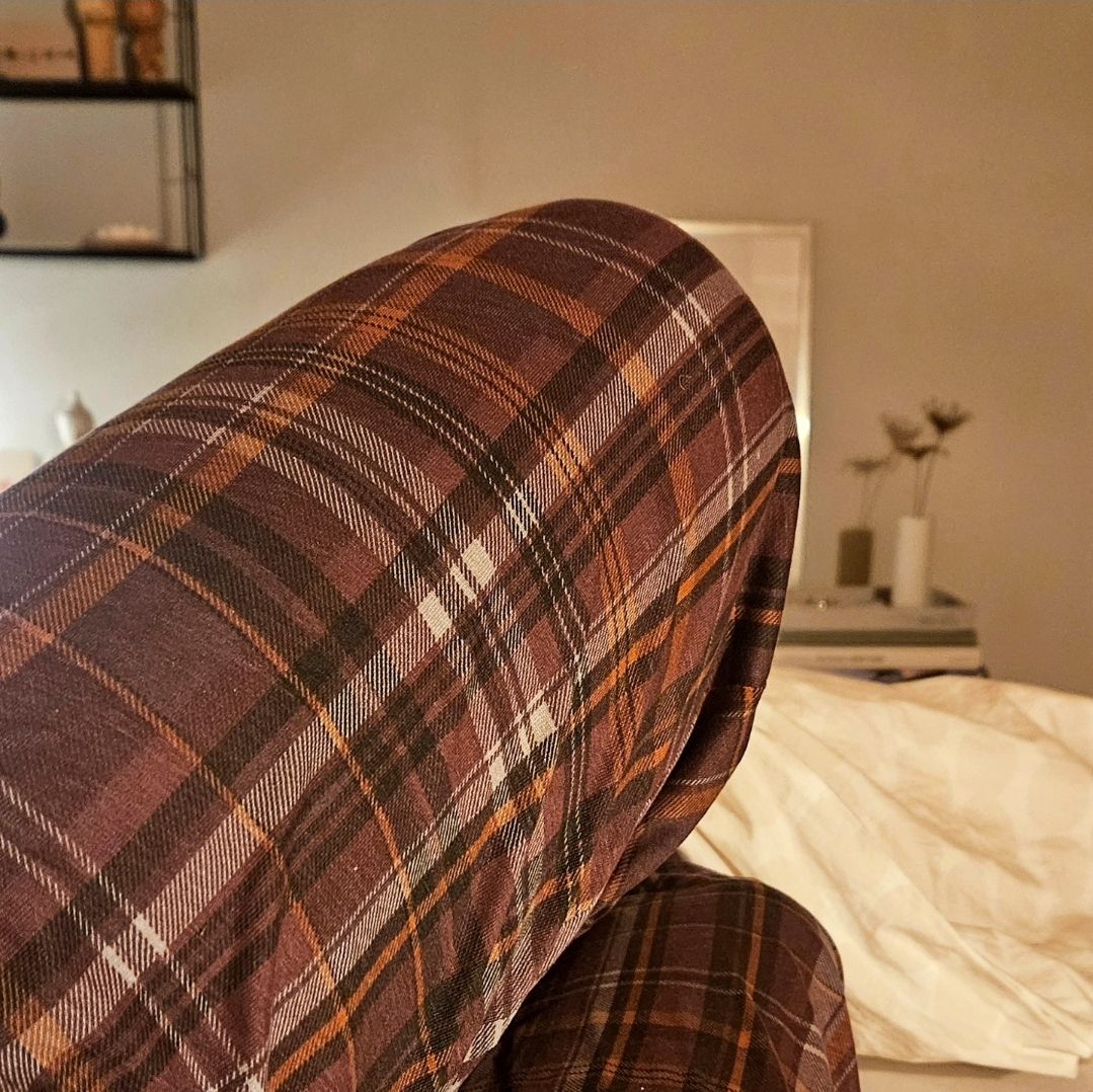 Seit ein paar Wochen besitze ich nicht nur einen Weihnachtspyjama mit Karos, sondern auch eine herbstliche Variante in Lila und Orange. Da könnte ich den ganzen Tag drin leben!