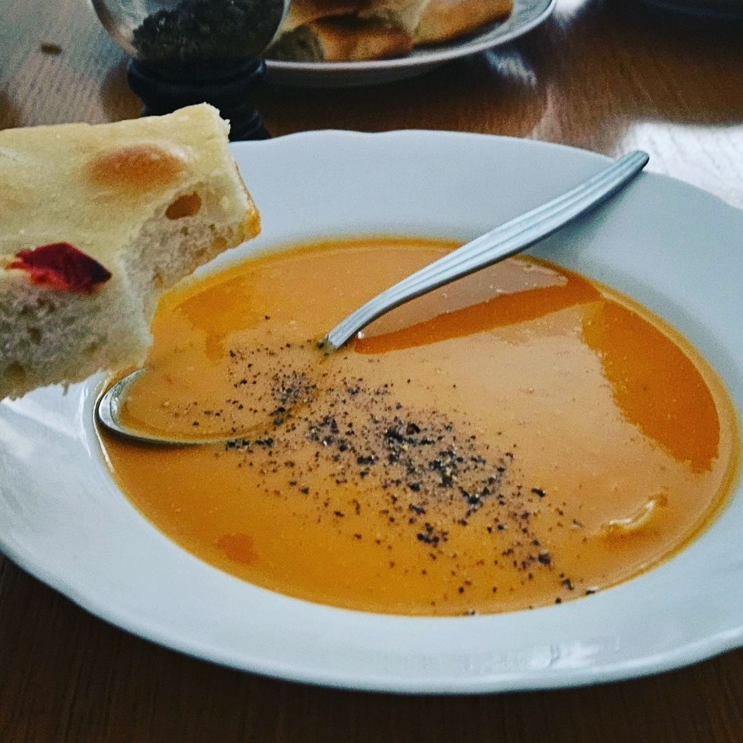 Mittagspause mit den Eltern. Heute im Angebot: Tomatensuppe und Focaccia.